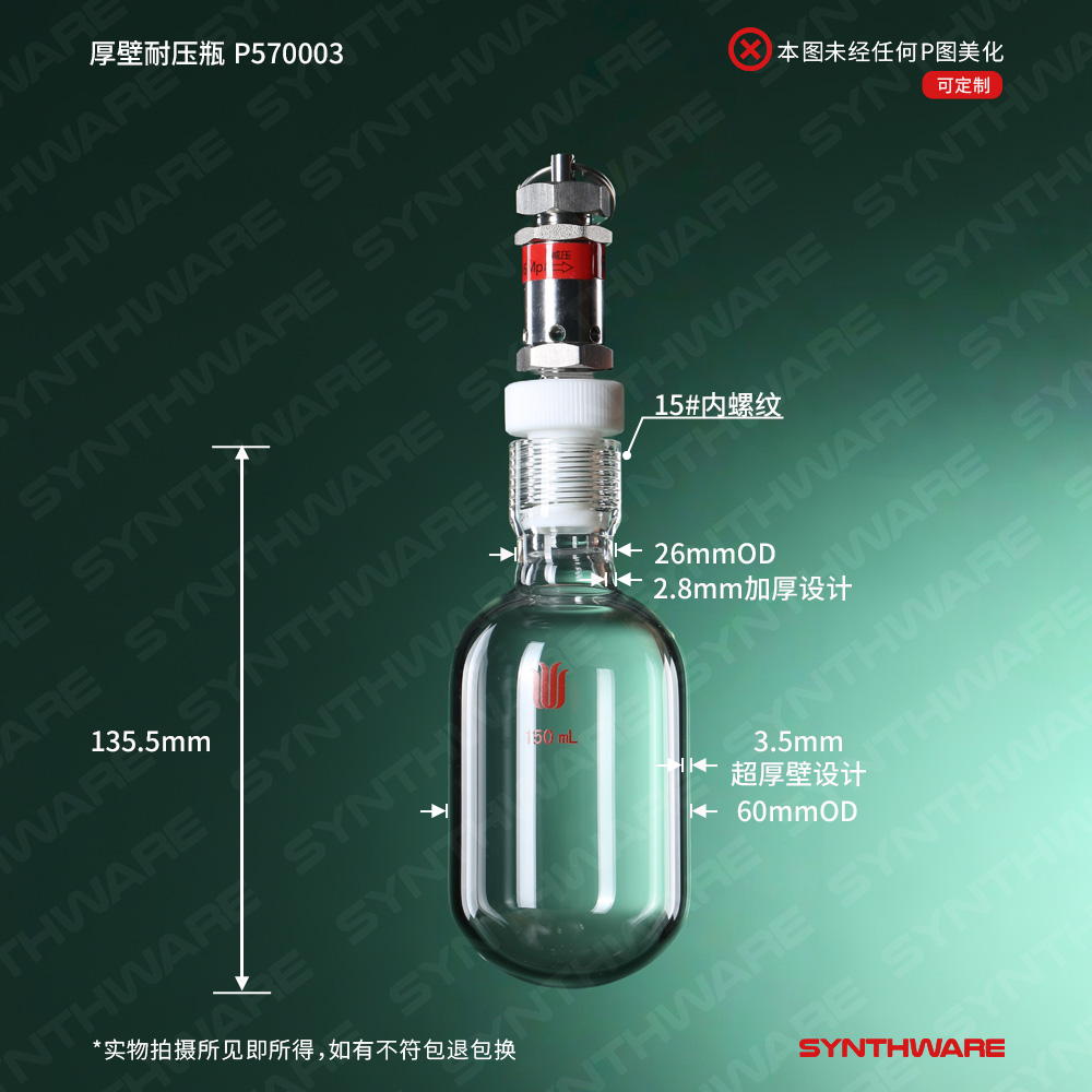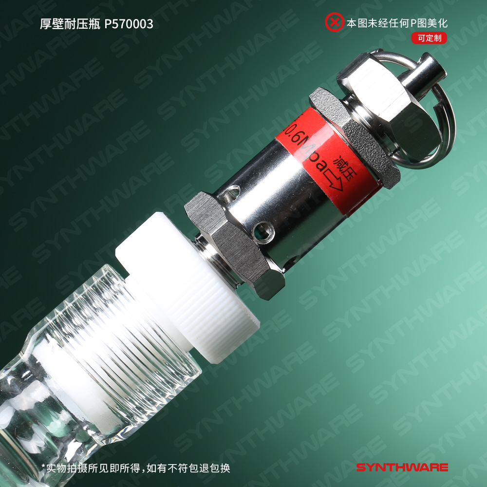 # 厚壁耐压管为内螺纹口,瓶身采用3.3高硼硅厚壁玻璃管制得,标配四氟螺纹盖(含四氟密封环)和0.6 MPa泄压阀。