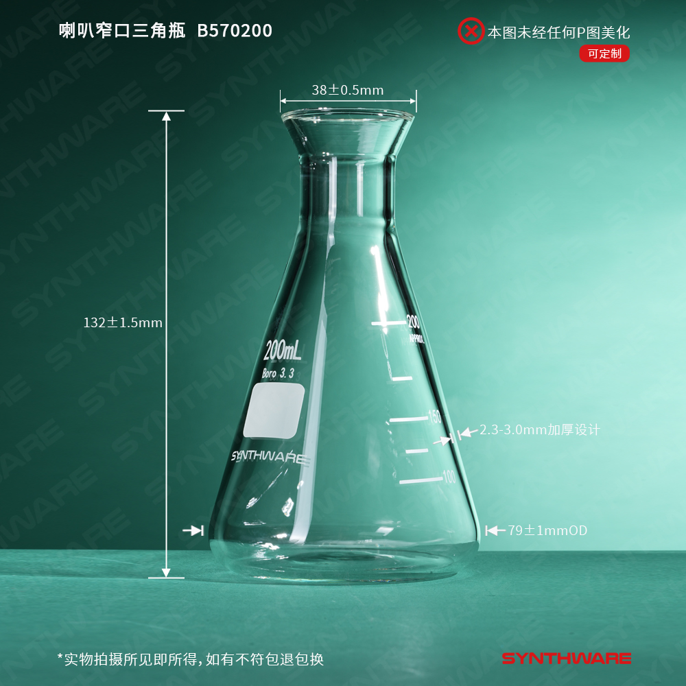 喇叭窄口三角瓶,厚壁带刻度,容量200ml,口内径:23mm B550200 B570200