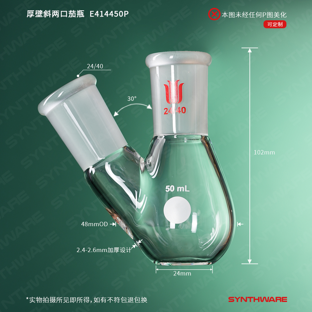厚壁斜两口茄瓶,平底,高强度,中间磨口:24/40,侧磨口:19/22,50ml E414950P