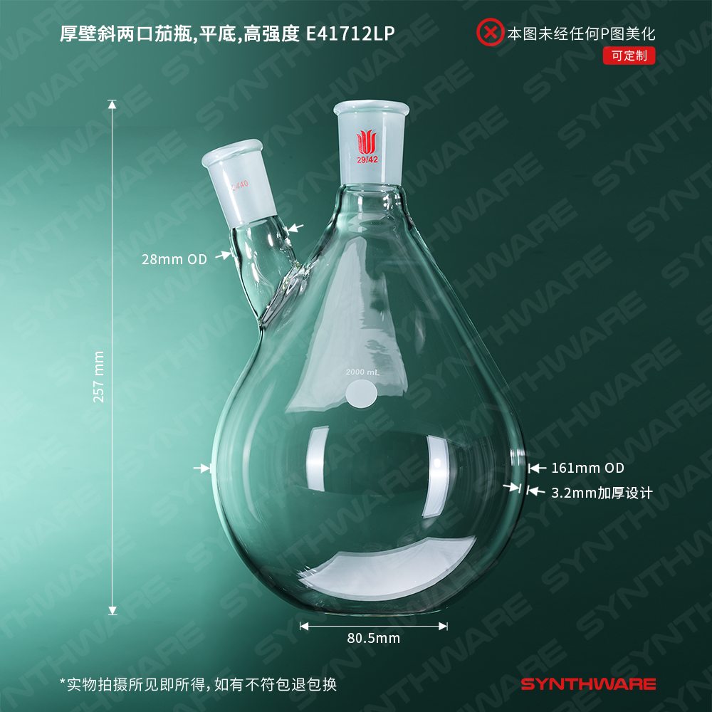 厚壁斜两口茄瓶,平底,高强度,中间磨口:29/42,侧磨口:29/42,2000ml E41722LP