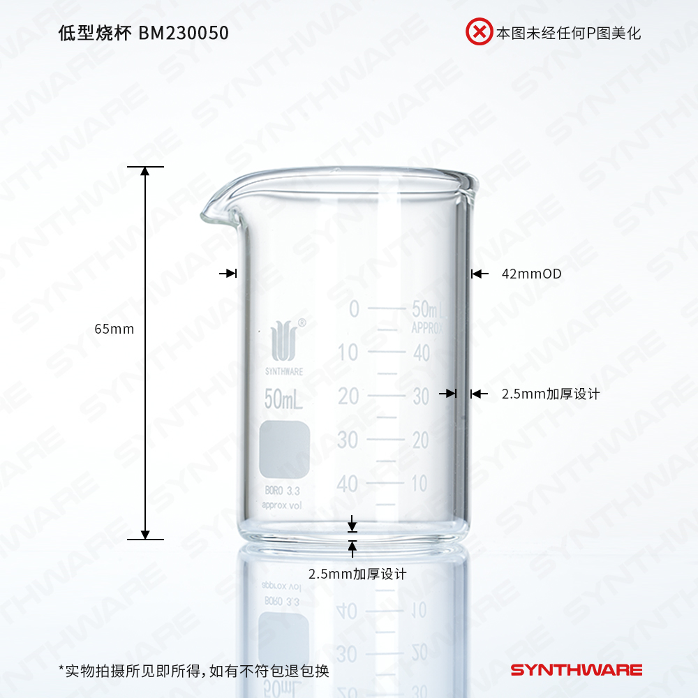# 采用数控机床生产工艺使烧杯厚壁且均匀,烧杯壁和底部的厚度是市场上普通烧杯壁厚的2倍。烧杯整体加厚设计,增加了烧杯的抗机械冲击强度。