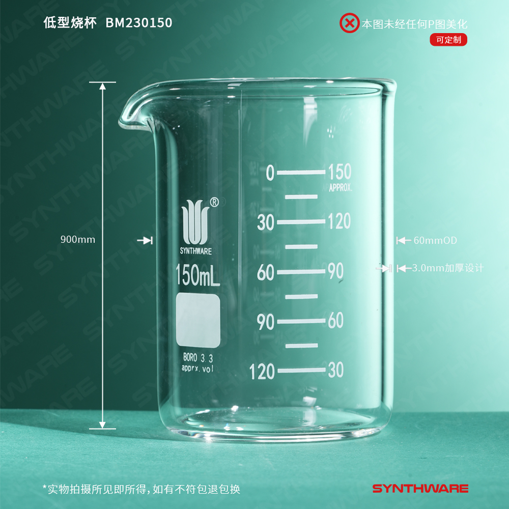 # 采用数控机床生产工艺使烧杯厚壁且均匀,烧杯壁和底部的厚度是市场上普通烧杯壁厚的2倍。烧杯整体加厚设计,增加了烧杯的抗机械冲击强度。