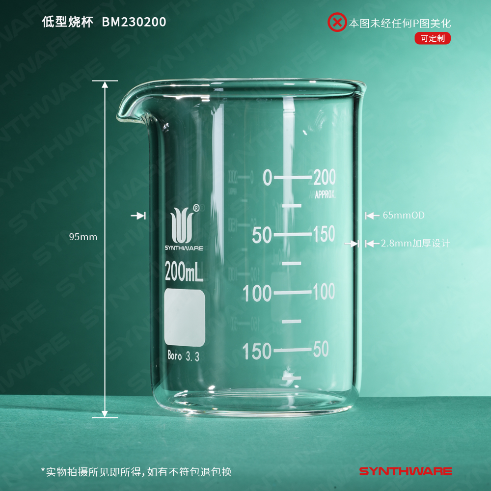 # 采用数控机床生产工艺使烧杯厚壁且均匀,烧杯壁和底部的厚度是市场上普通烧杯壁厚的2倍。烧杯整体加厚设计,增加了烧杯的抗机械冲击强度。