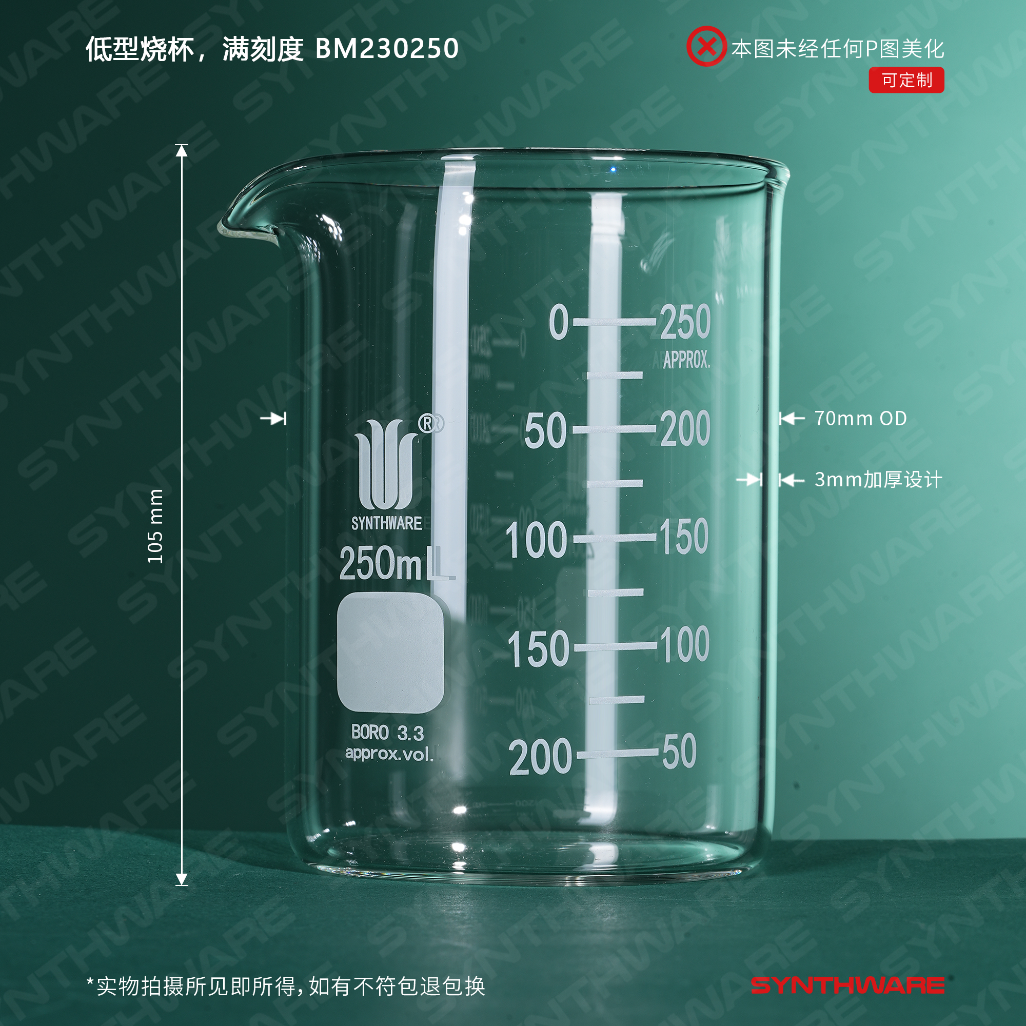 # 采用数控机床生产工艺使烧杯厚壁且均匀,烧杯壁和底部的厚度是市场上普通烧杯壁厚的2倍。烧杯整体加厚设计,增加了烧杯的抗机械冲击强度。