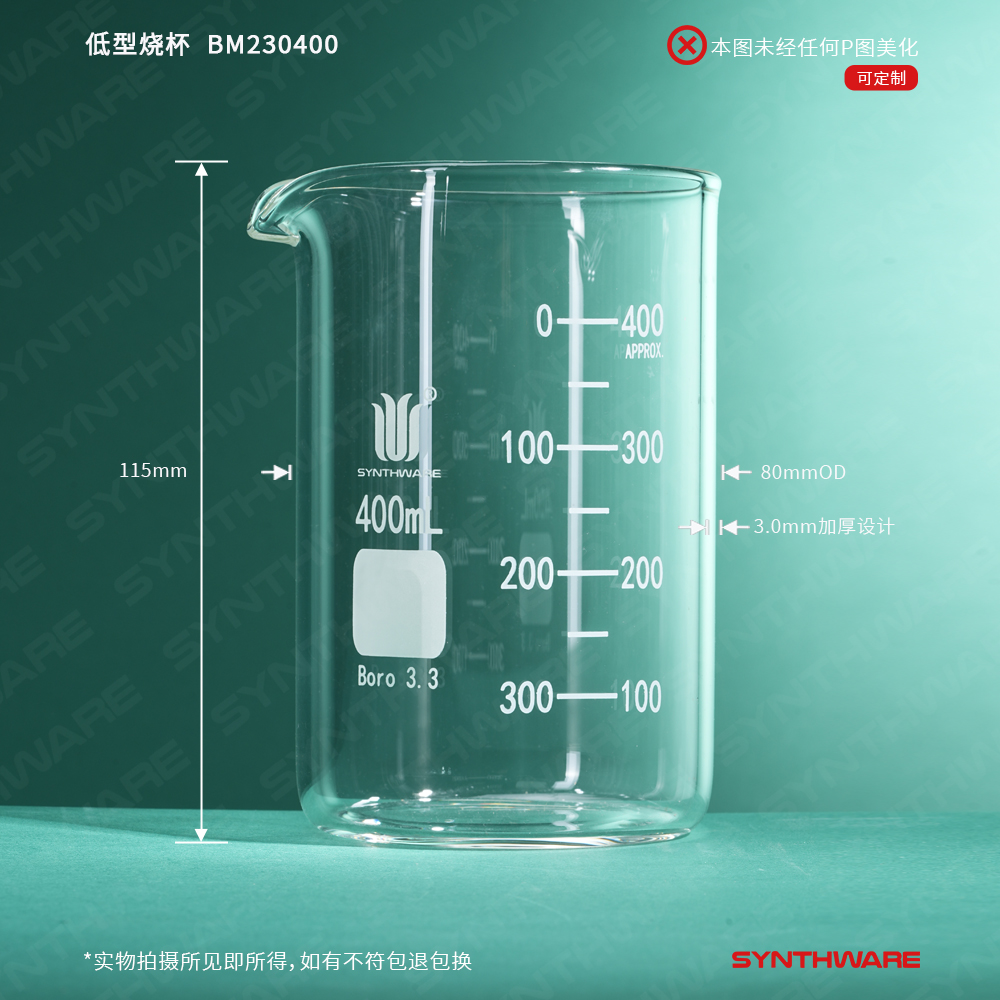 # 采用数控机床生产工艺使烧杯厚壁且均匀,烧杯壁和底部的厚度是市场上普通烧杯壁厚的2倍。烧杯整体加厚设计,增加了烧杯的抗机械冲击强度。