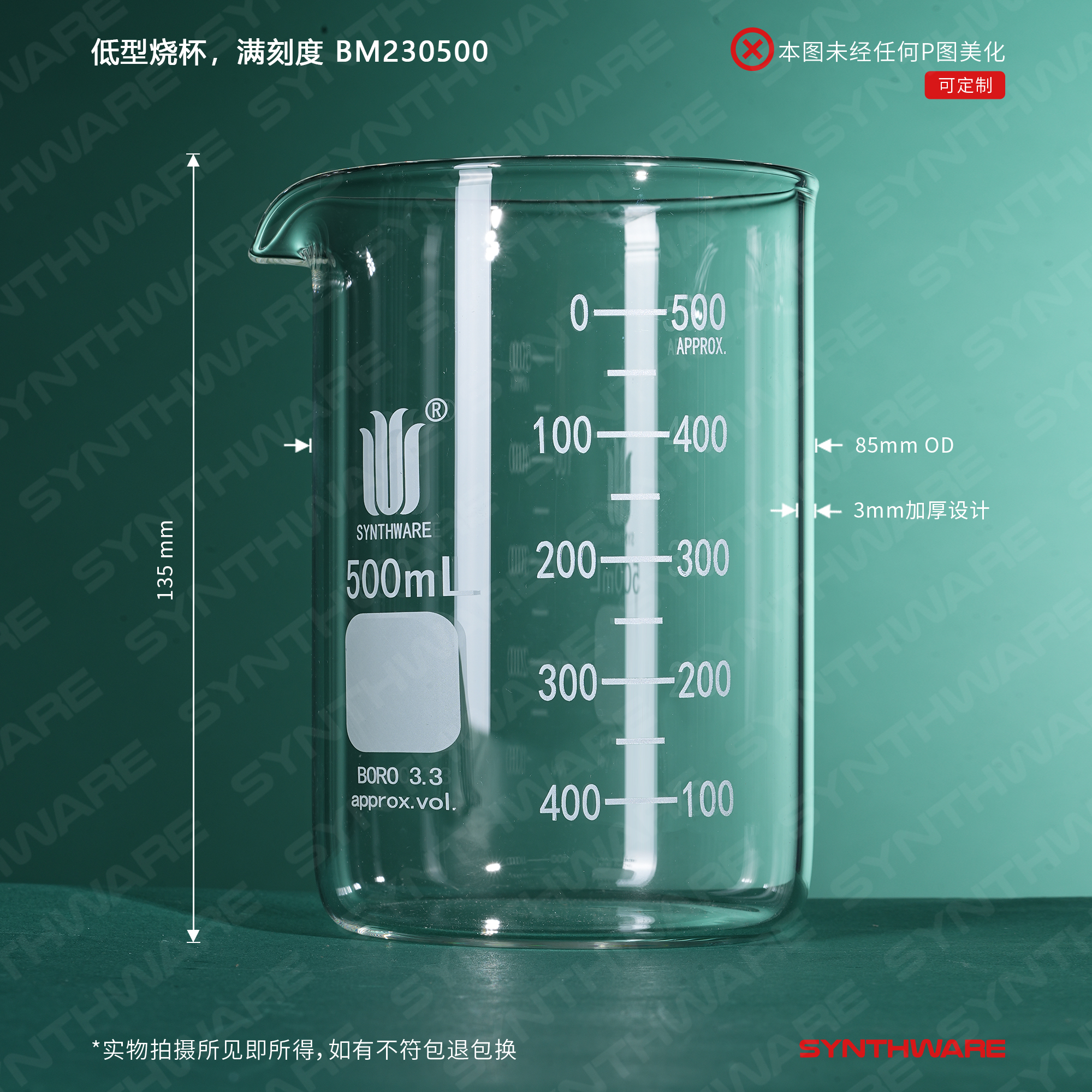 自制厚壁烧杯,双刻度线500ML,直径90*高度125*壁厚2.5mm,10个/盒 B220500M