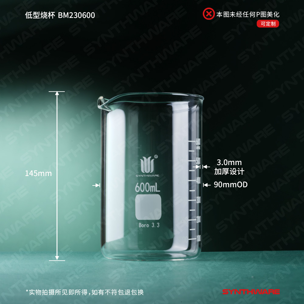 # 采用数控机床生产工艺使烧杯厚壁且均匀,烧杯壁和底部的厚度是市场上普通烧杯壁厚的2倍。烧杯整体加厚设计,增加了烧杯的抗机械冲击强度。