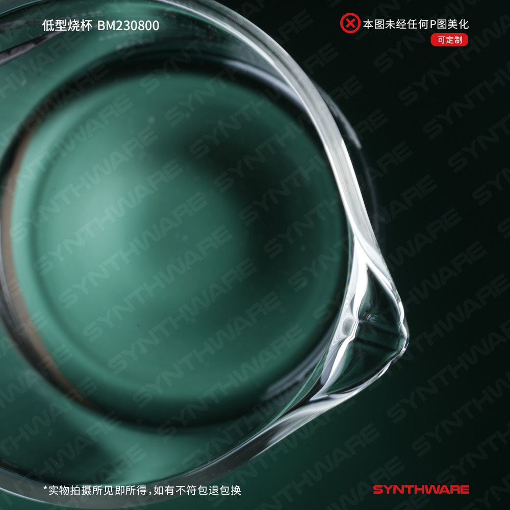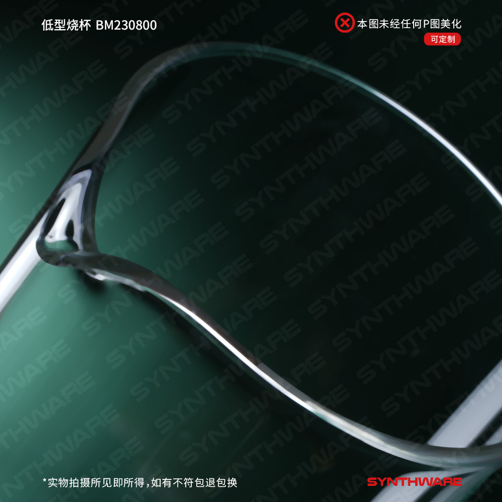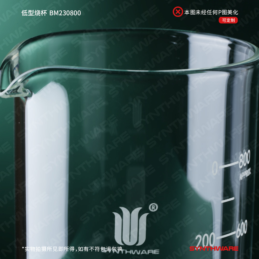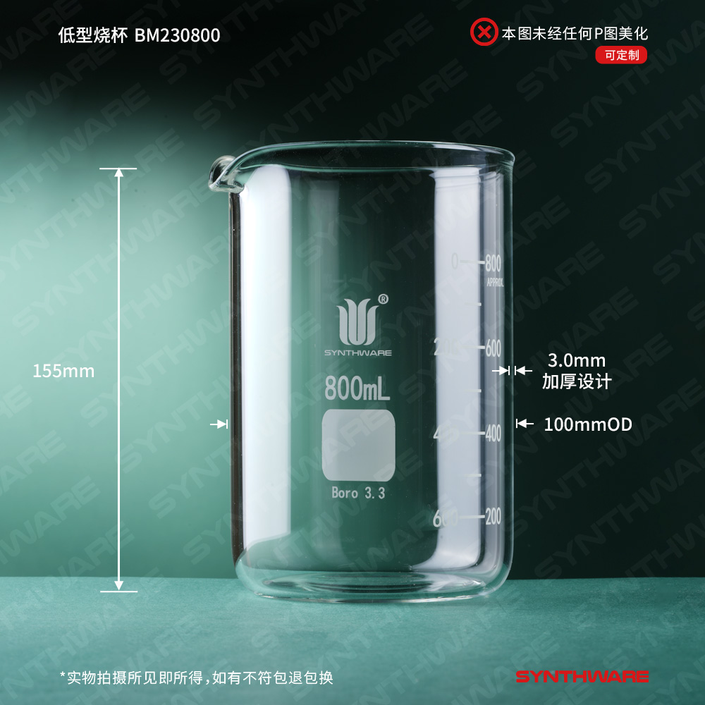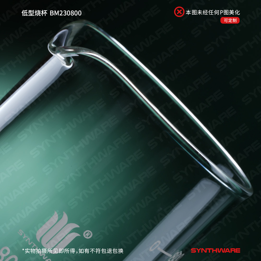 # 采用数控机床生产工艺使烧杯厚壁且均匀,烧杯壁和底部的厚度是市场上普通烧杯壁厚的2倍。烧杯整体加厚设计,增加了烧杯的抗机械冲击强度。