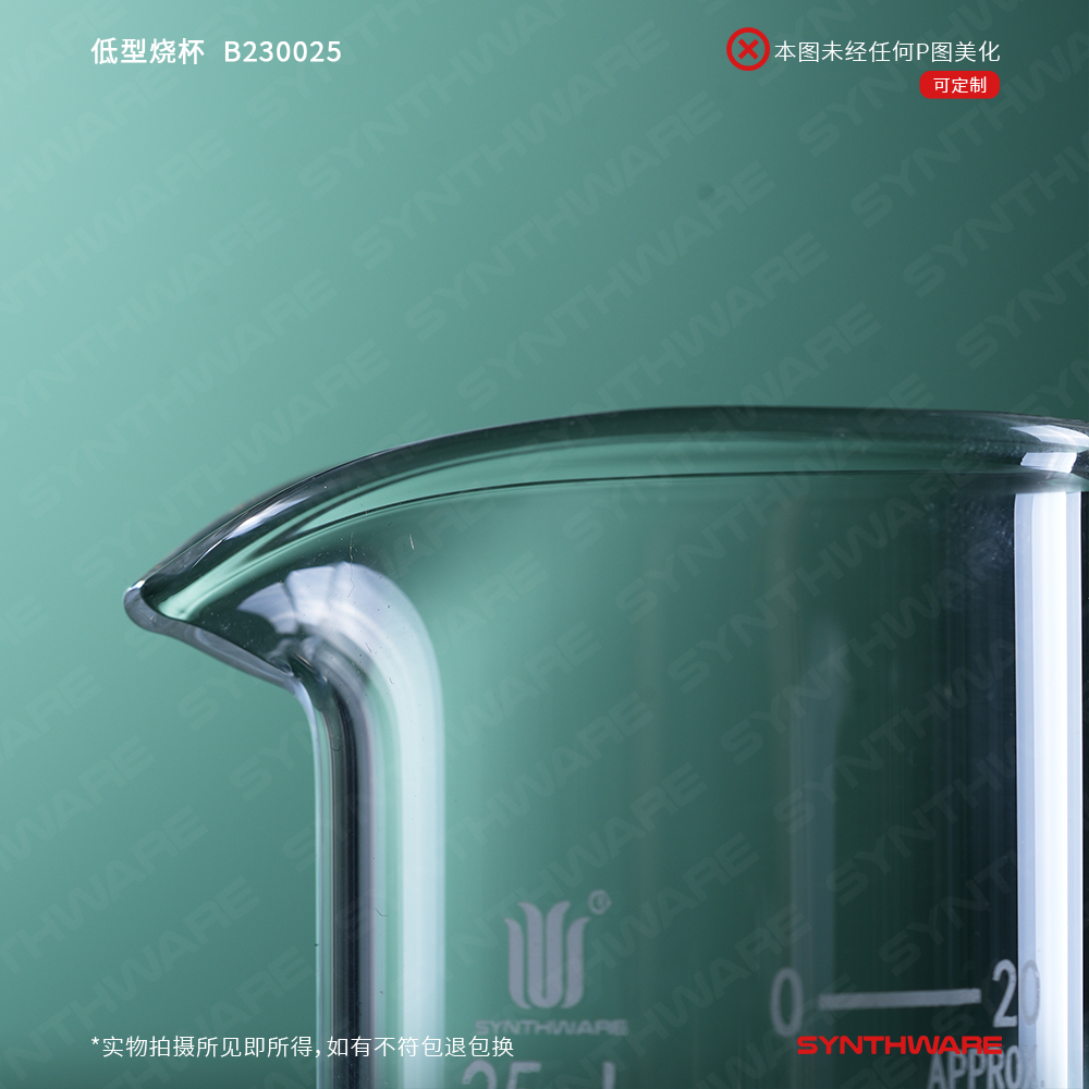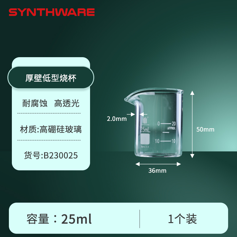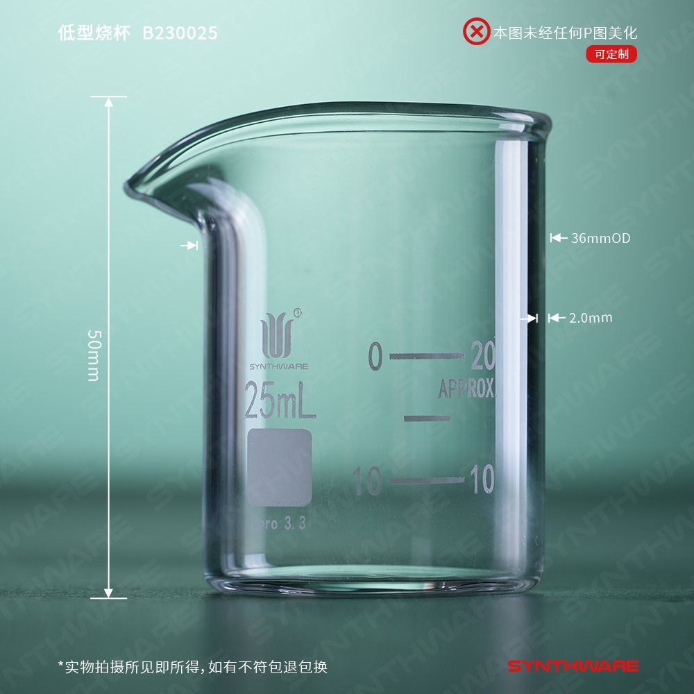 # 采用数控机床生产工艺使烧杯厚壁且均匀,烧杯壁和底部的厚度是市场上普通烧杯壁厚的2倍。烧杯整体加厚设计,增加了烧杯的抗机械冲击强度。