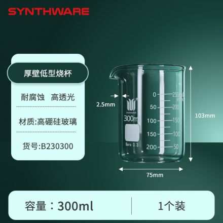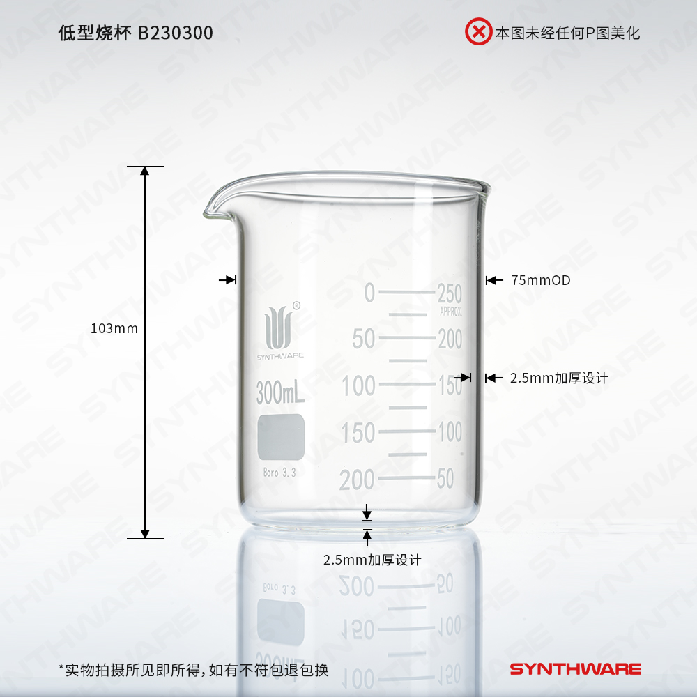 # 采用数控机床生产工艺使烧杯厚壁且均匀,烧杯壁和底部的厚度是市场上普通烧杯壁厚的2倍。烧杯整体加厚设计,增加了烧杯的抗机械冲击强度。