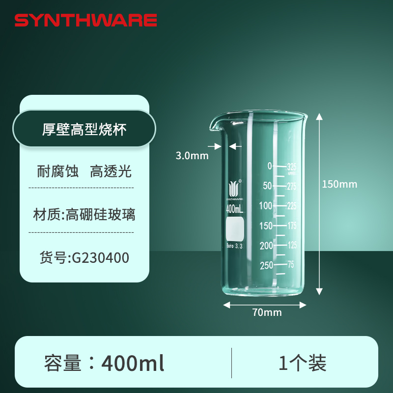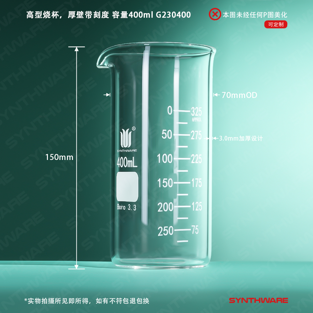 # 采用数控机床生产工艺使烧杯厚壁且均匀,烧杯壁和底部的厚度是市场上普通烧杯壁厚的2倍。烧杯整体加厚设计,增加了烧杯的抗机械冲击强度。