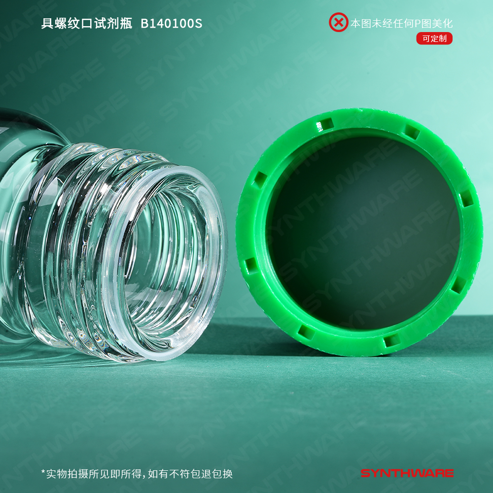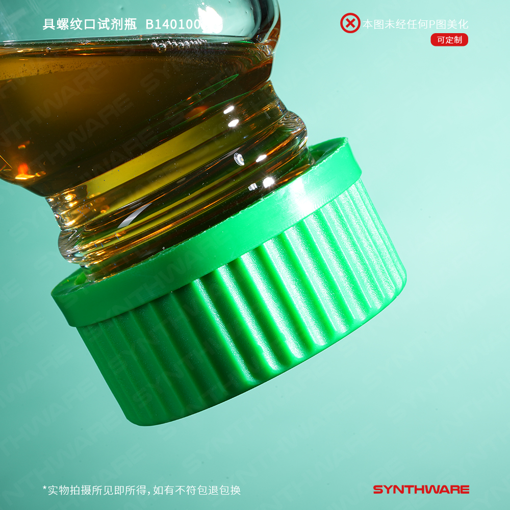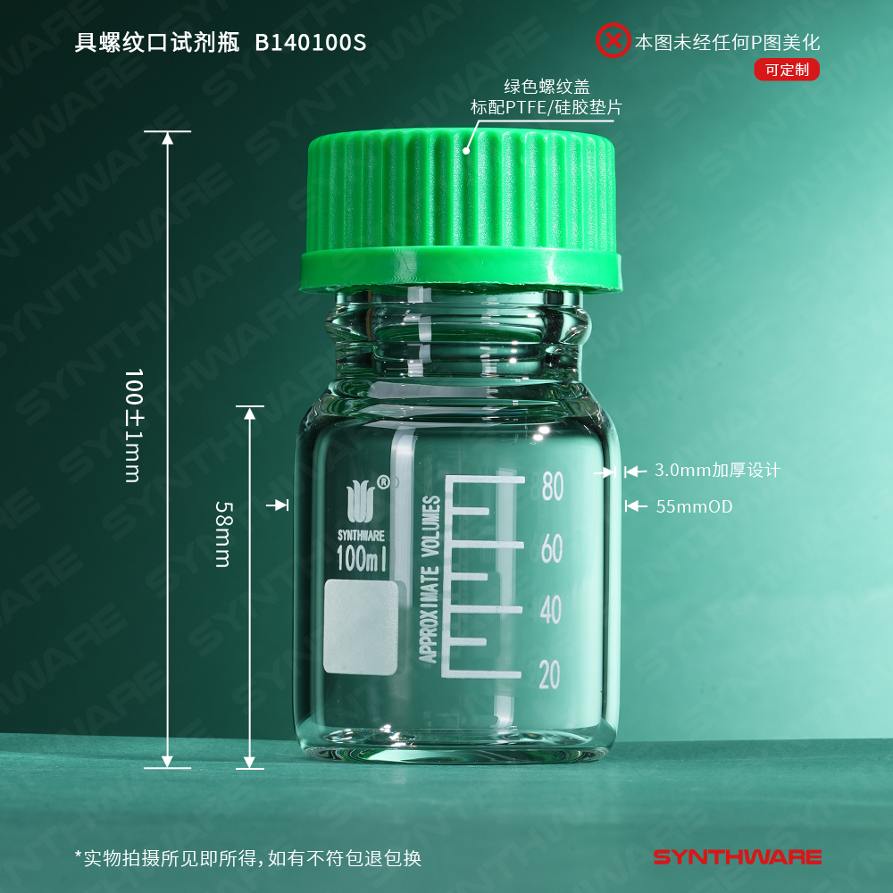 具螺纹口试剂瓶 100ml GL45,标配绿色螺纹盖,含密封圈,标配PTFE/硅胶垫片 B140100S