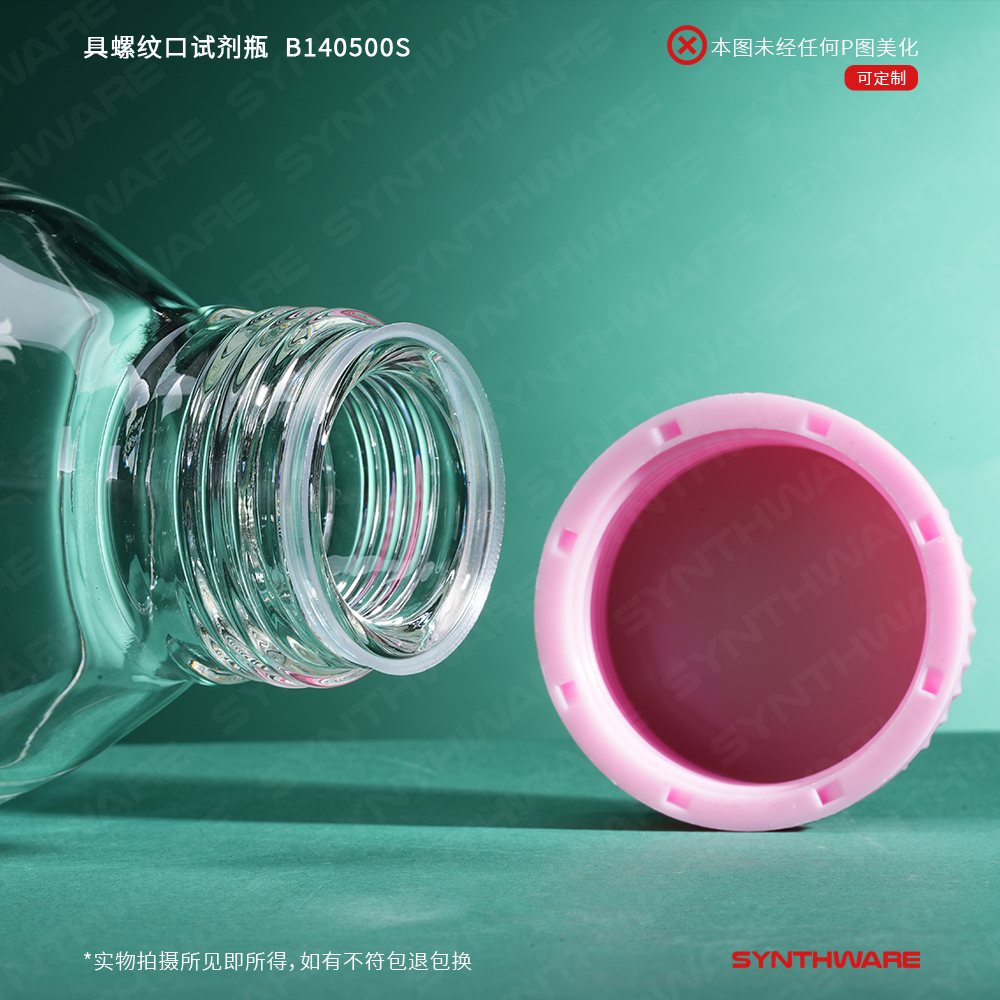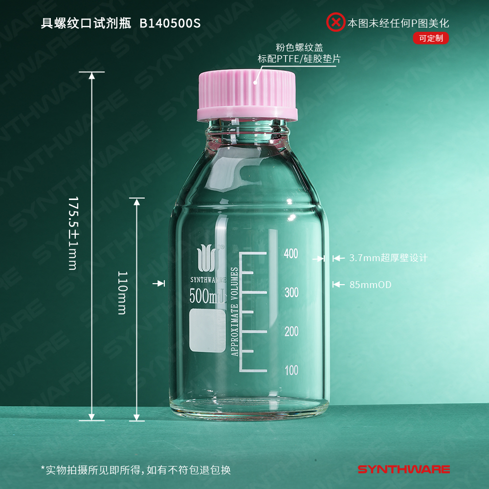具螺纹口试剂瓶 500ml GL45,标配粉色螺纹盖,含密封圈,标配PTFE/硅胶垫片 B140500S
