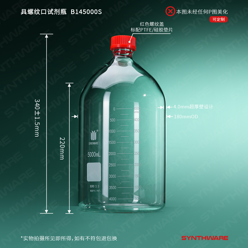 具盖螺纹口试剂瓶5000ML GL45,标配红色螺纹盖,含密封圈,标配PTFE/硅胶垫片 B145000S