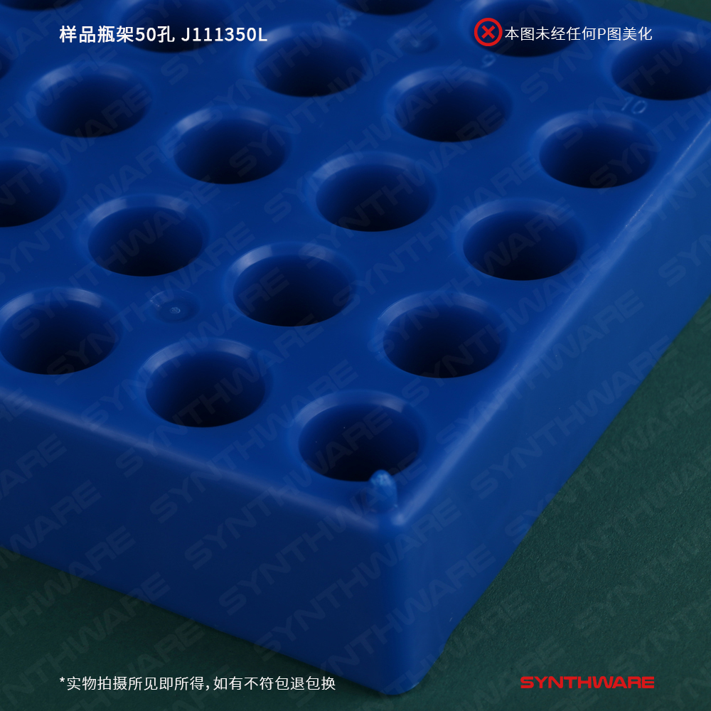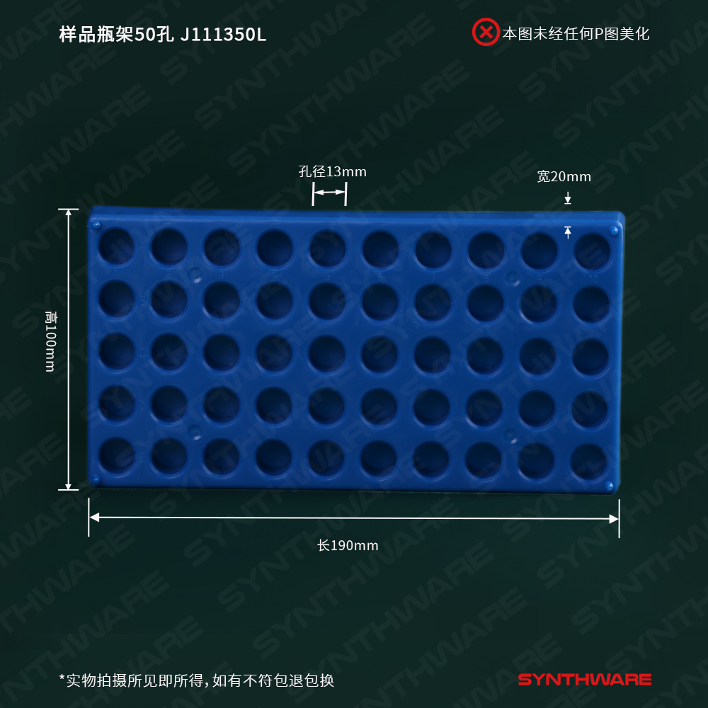 样品瓶架50孔(孔径13mm),蓝色PP塑料,长*宽*高mm:190*100*20 J111350L
