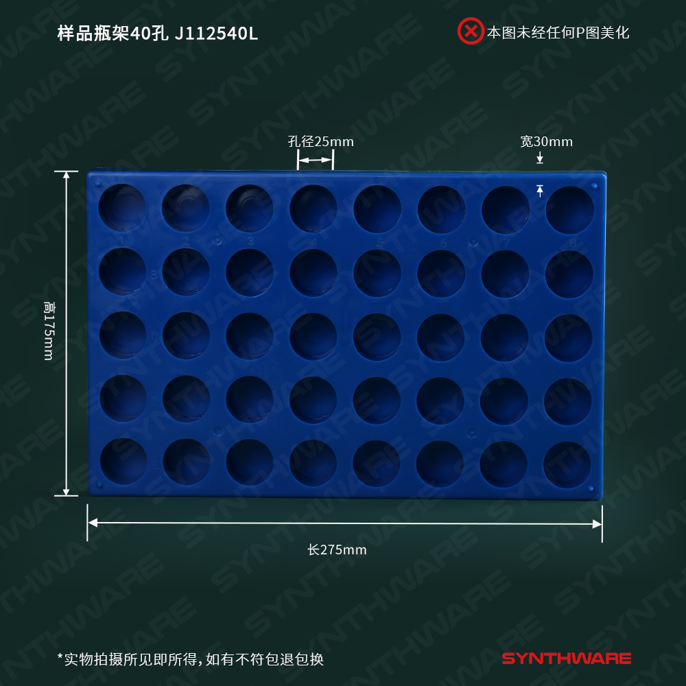 样品瓶架40孔(孔径28mm),蓝色PP塑料,长*宽*高mm:275*175*30 J112840L