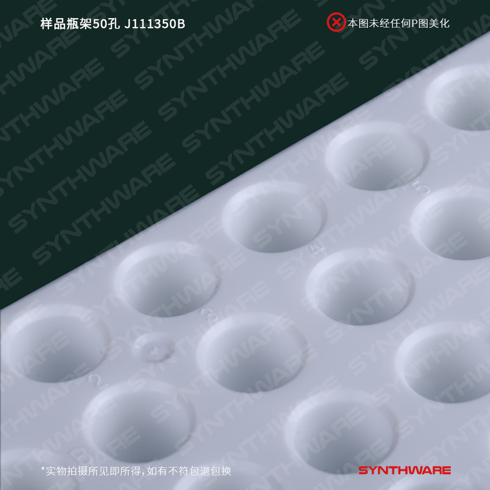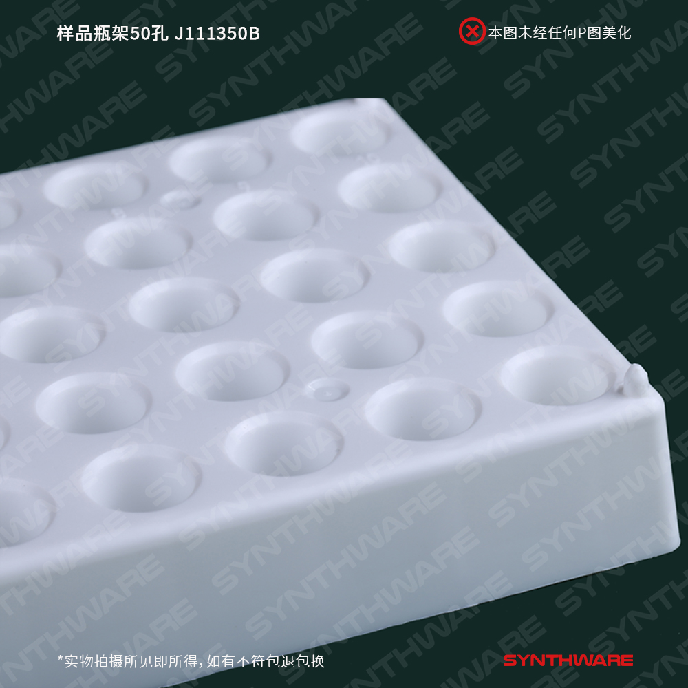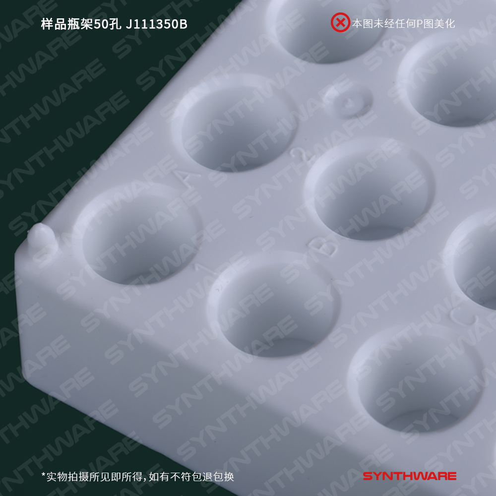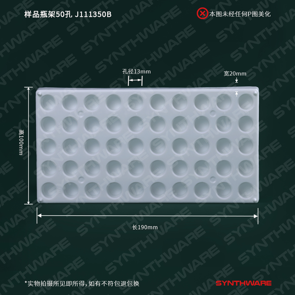 样品瓶架50孔(孔径13mm),白色PP塑料,长*宽*高mm:190*100*20 J111350B
