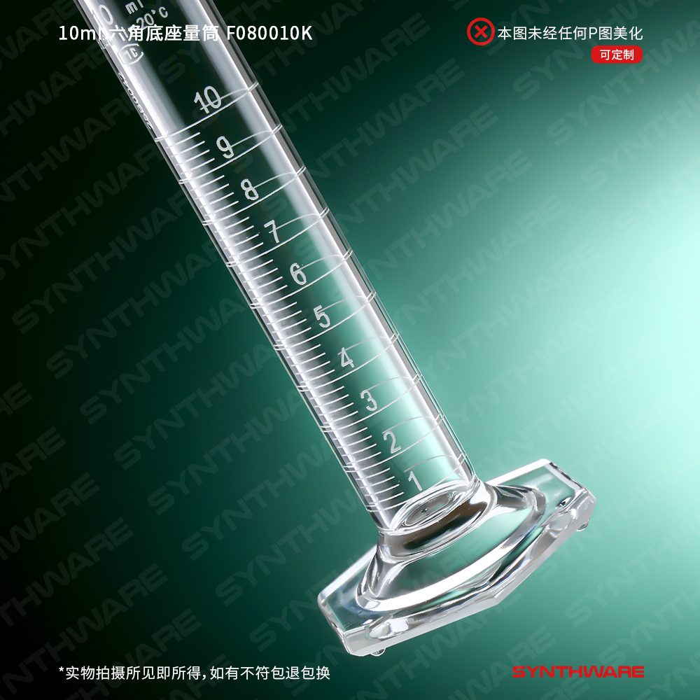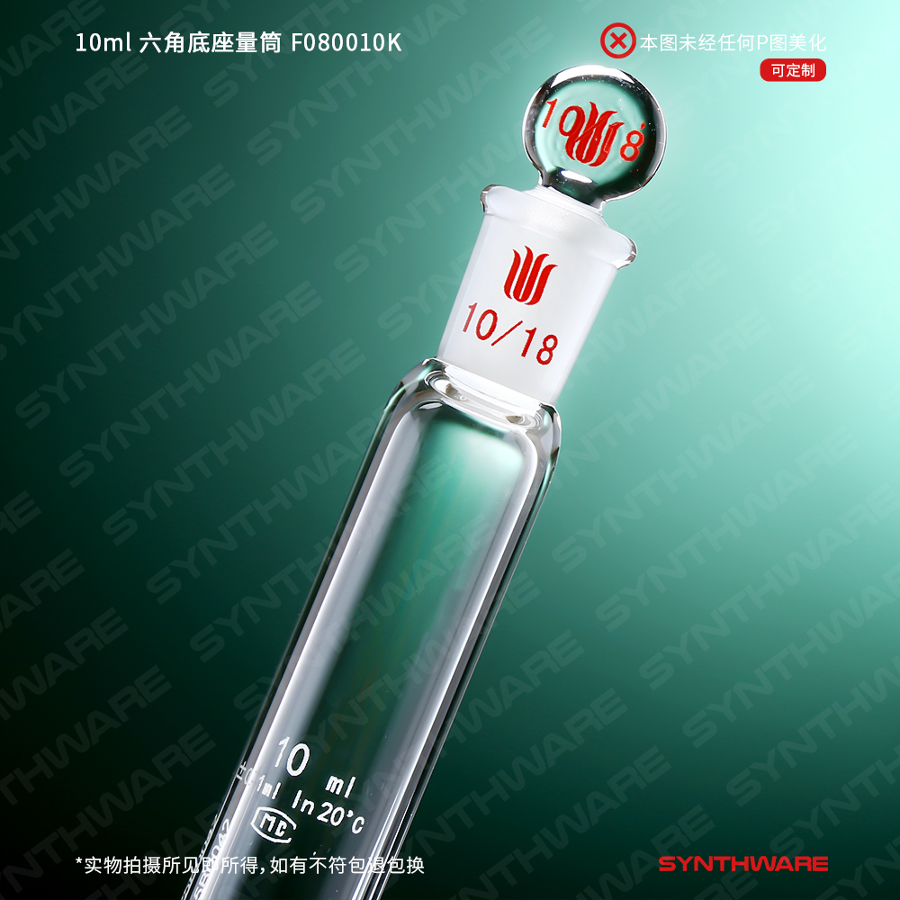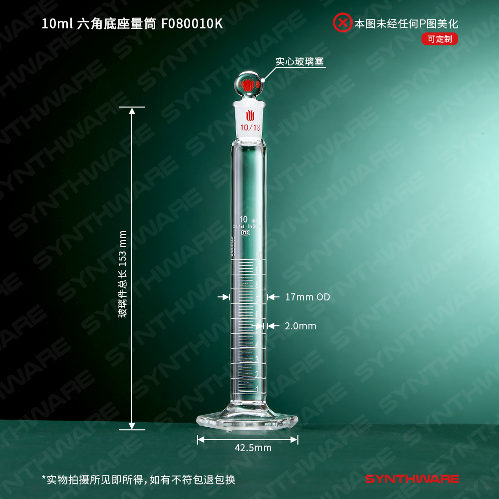 10ml 六角底座量筒,高硼硅透明玻璃,磨口10/18标配玻璃塞,1支 F080010K