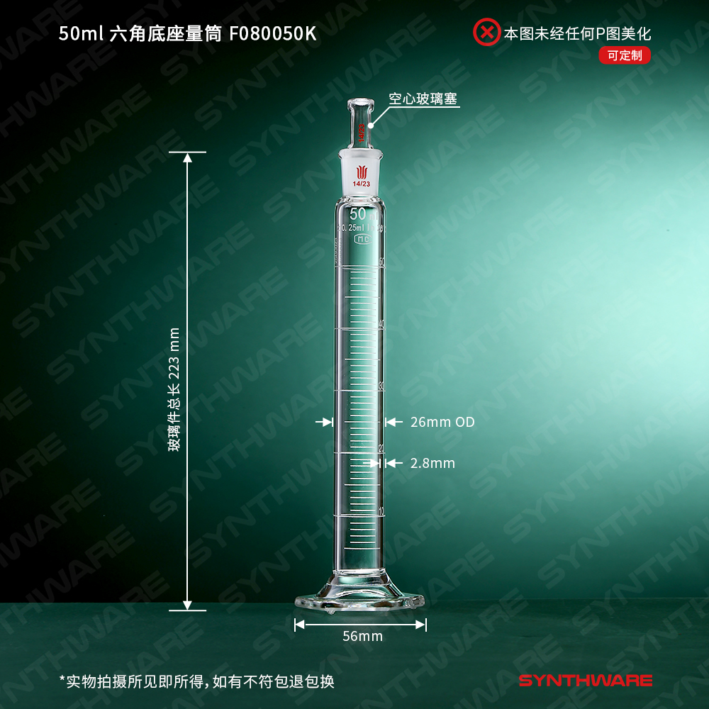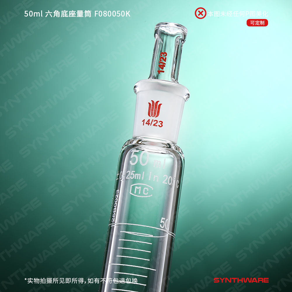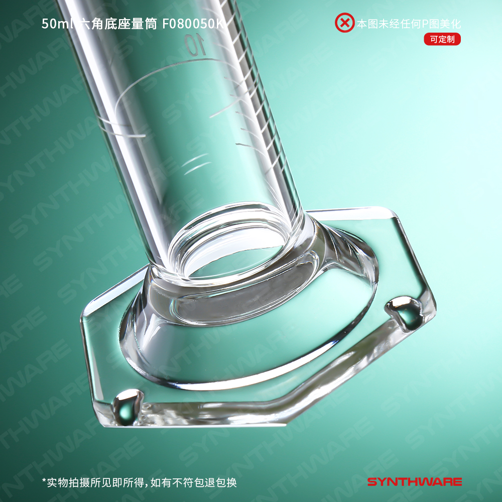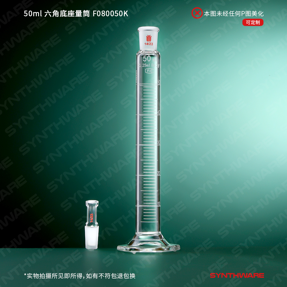 50ml 六角底座量筒,高硼硅透明玻璃,磨口14/23标配塑料口塞,1支 F080050S