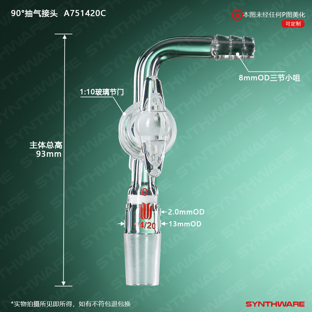90°抽气接头,玻璃节门,14/20,2mm节门孔径 A751420