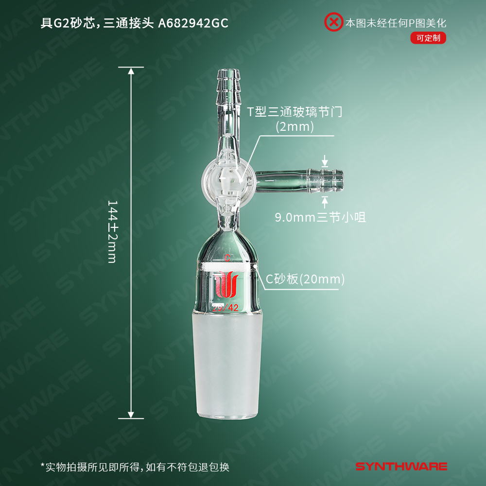 具G3砂芯,三通接头,外磨口:29/42,具2mmT型三通玻璃节门 A682942GM