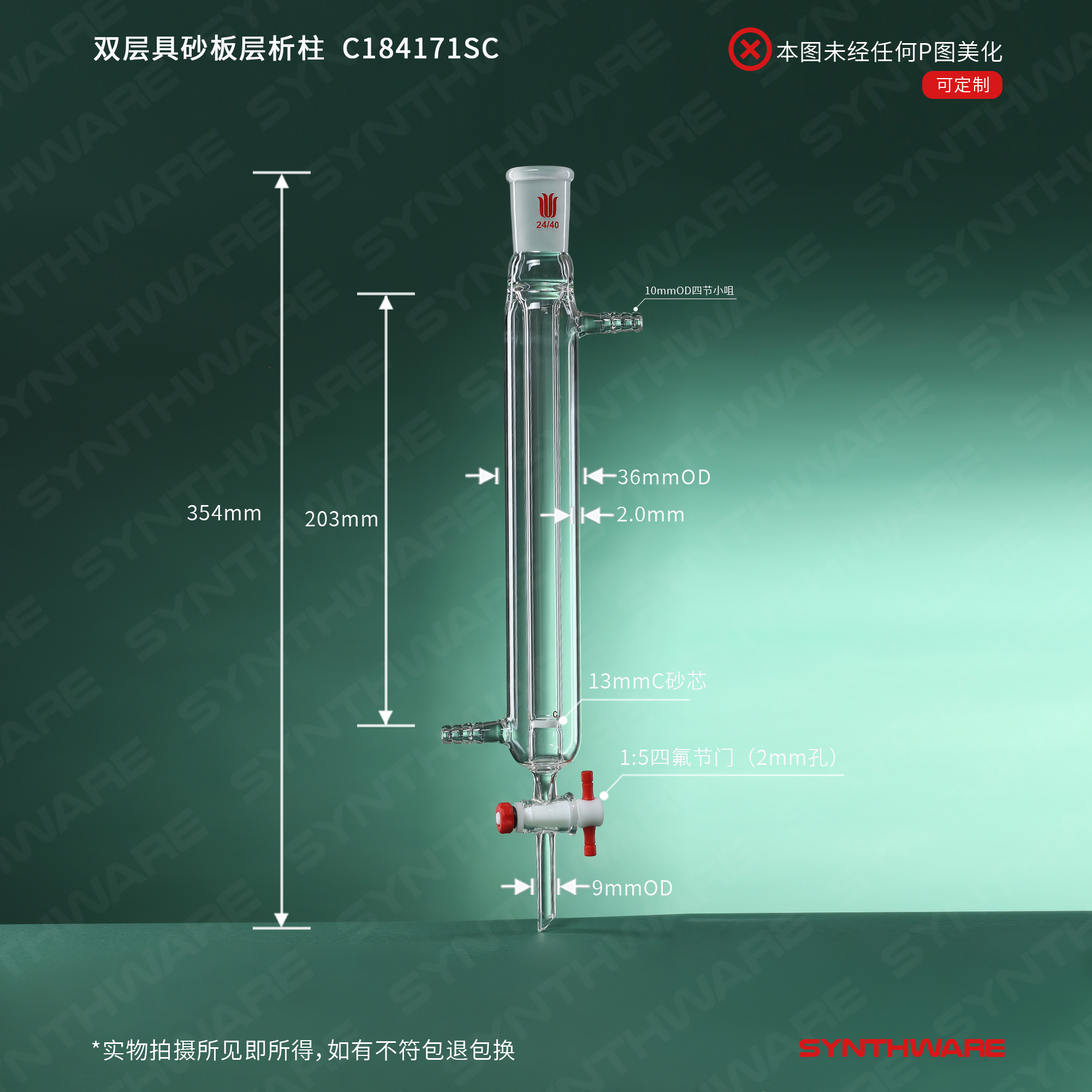 > 双层具砂板层析柱,内管外径17mm,内管内径13.4mm,内管有效长度203mm,节门孔径2mm,24/40 C184171SC