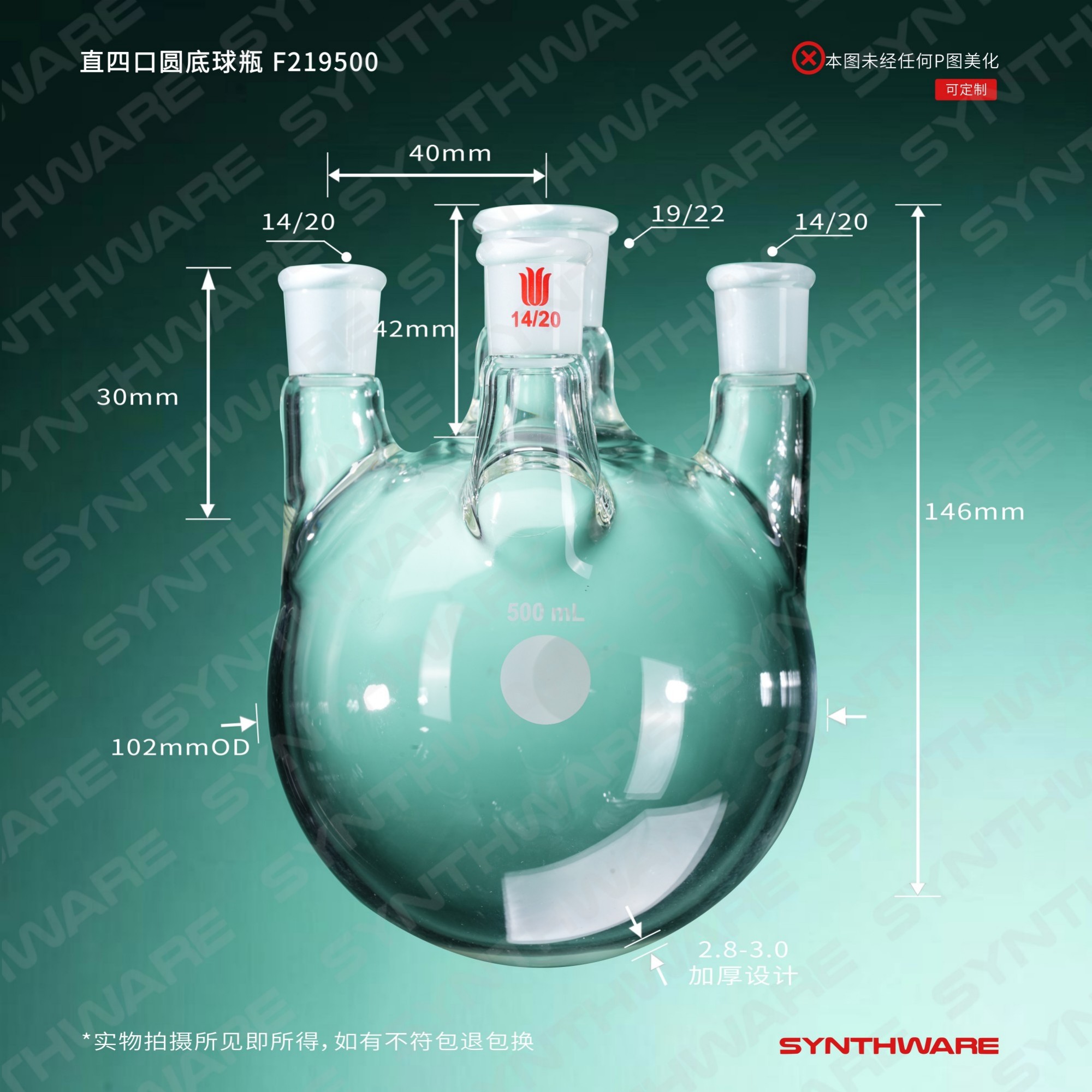 直四口圆底球瓶,中间磨口:19/22,侧磨口:14/20,500ml F219500