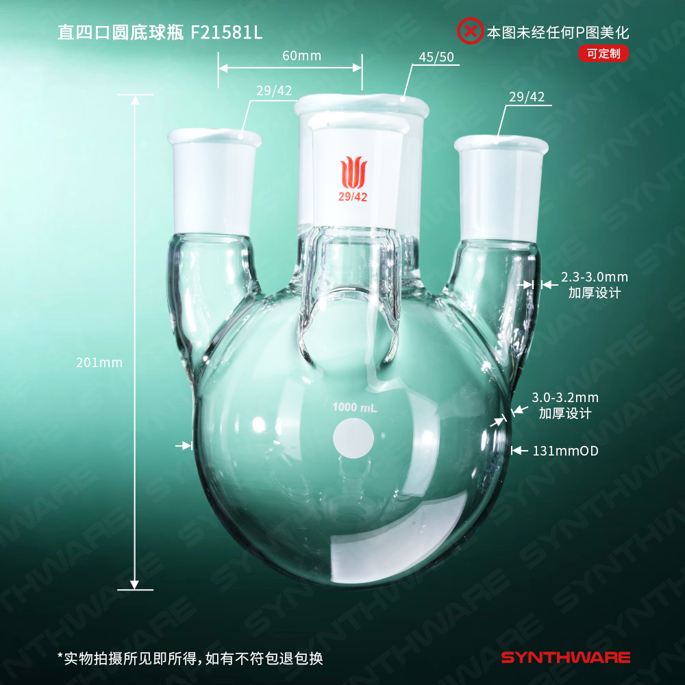 直四口圆底球瓶,中间磨口:45/50,侧磨口:29/42,1000ml F21581L