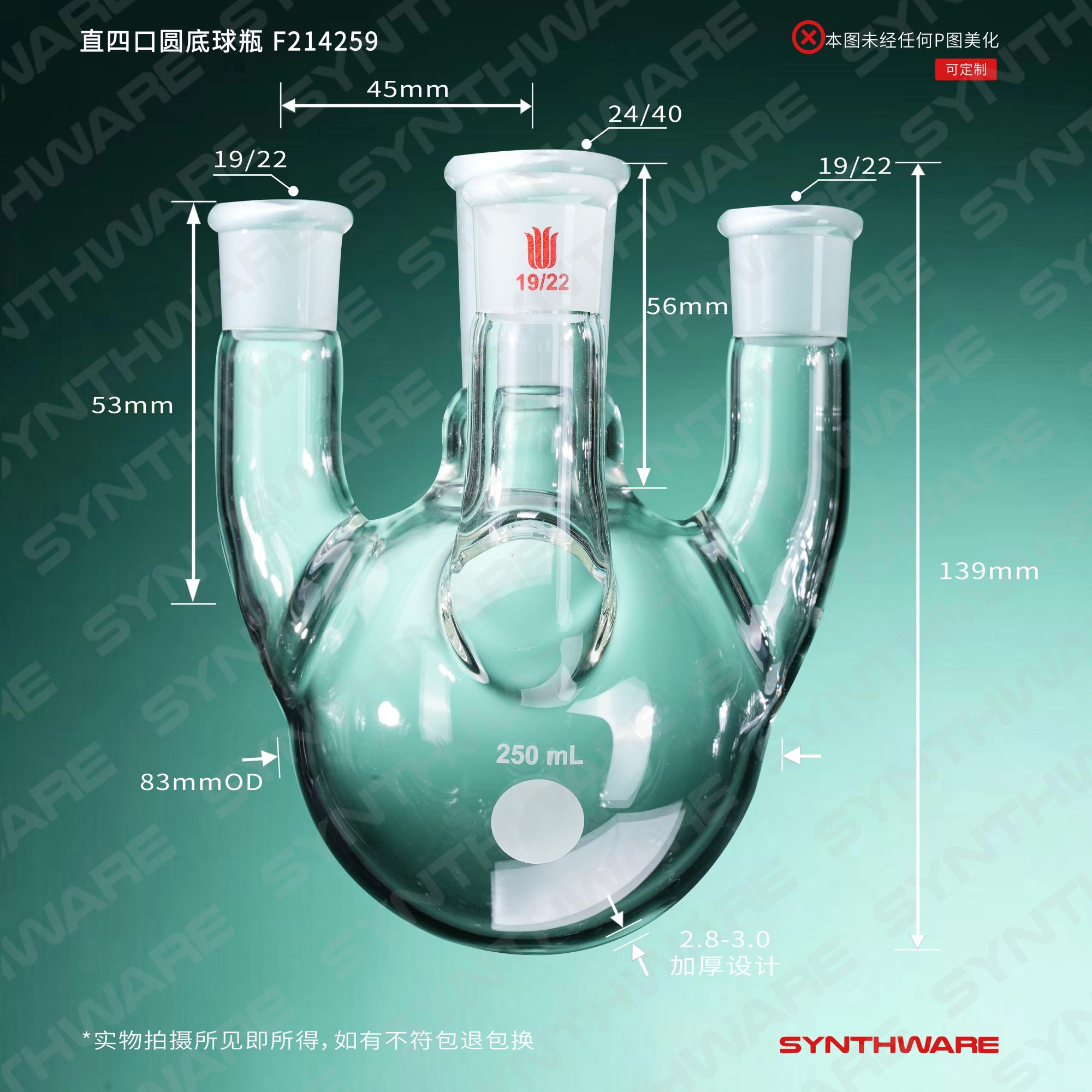 直四口圆底球瓶,中间磨口:24/40,侧磨口:19/22,250ml F214259