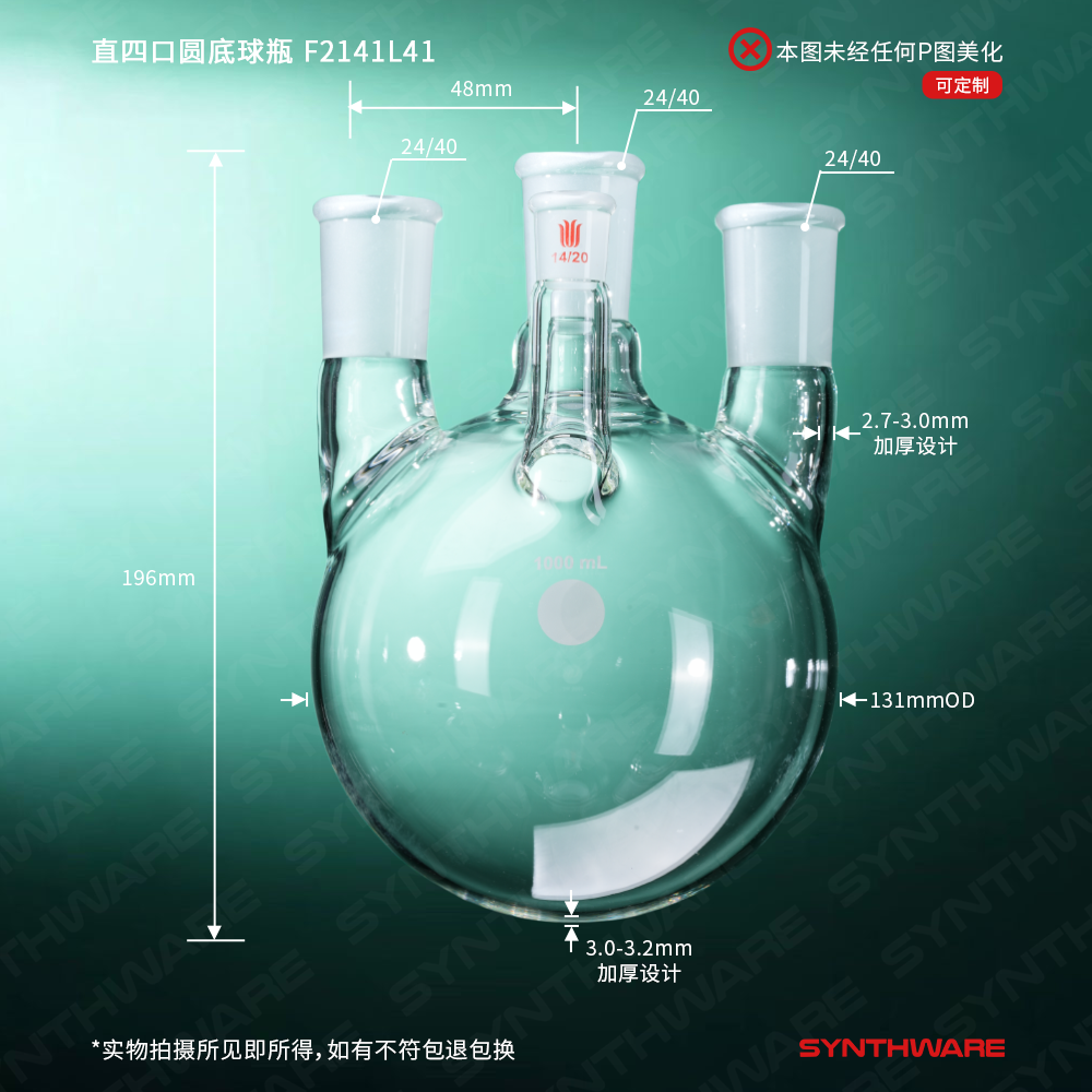 直四口圆底球瓶,主口:24/40,侧口:24/40,前口:14/20,1000ml F2141L41