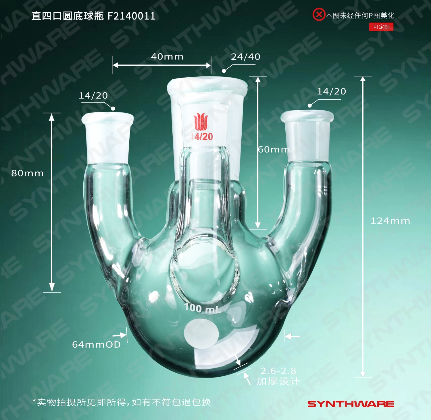 直四口圆底球瓶,中间磨口:24/40,侧口:14/20,前口:14/20,100ml F2140011