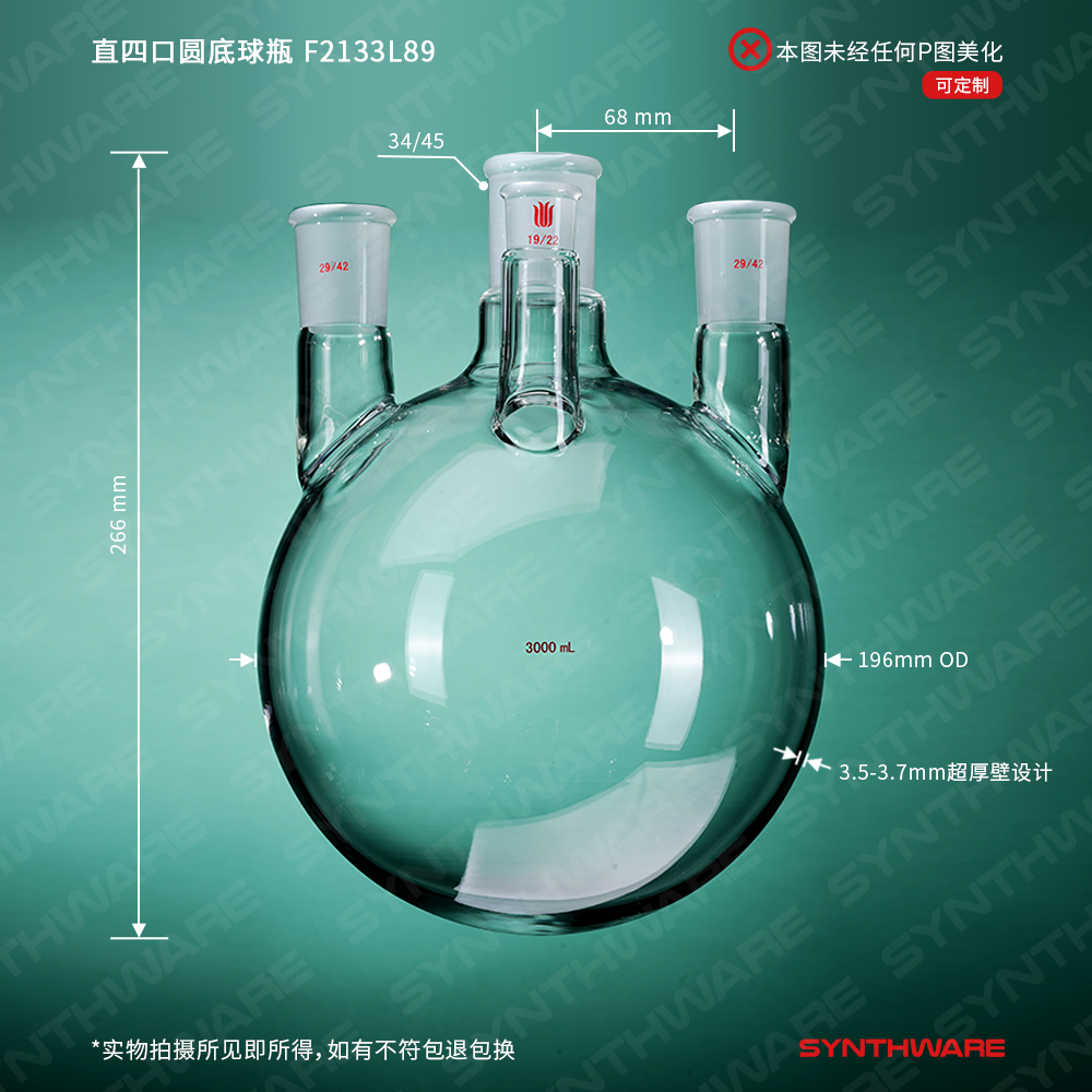 直四口圆底球瓶,主口:34/45,侧口:29/42,前口:19/22,3000ml F2133L89