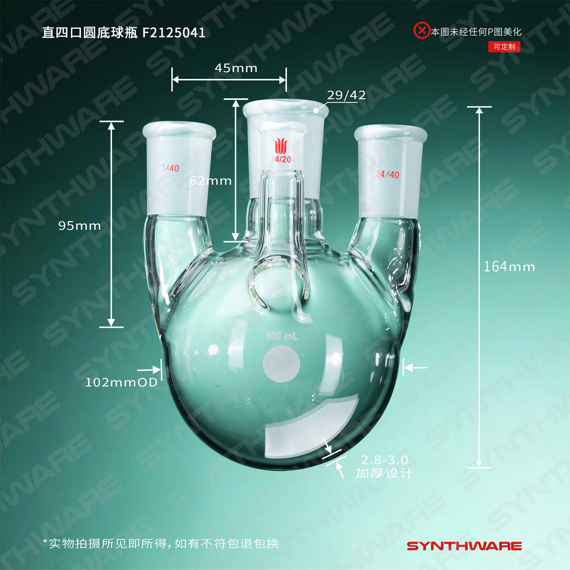 直四口圆底球瓶,主口:29/42,侧口:24/40,前口:14/20,500ml F2125041