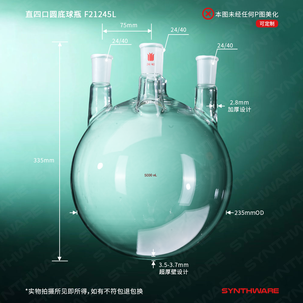直四口圆底球瓶,中间磨口:24/40,侧磨口:24/40,前口:24/40,5000ml F21245L