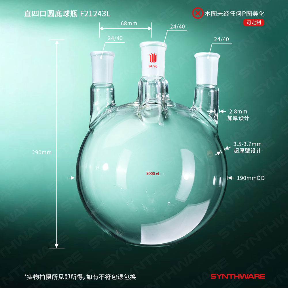 直四口圆底球瓶,中间磨口:24/40,侧磨口:24/40,前口:24/40,3000ml F21243L