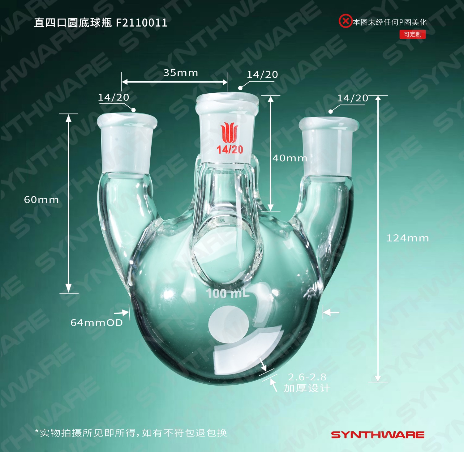 直四口圆底球瓶,中间磨口:14/20,侧磨口:14/20,前口:14/20,100ml F2110011
