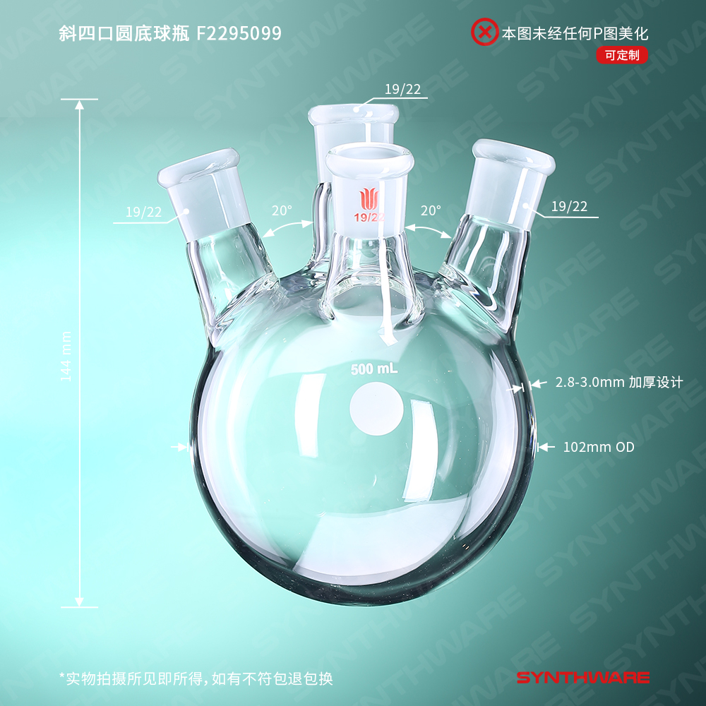 斜四口圆底球瓶,中间磨口:29/42,侧磨口:24/40,500ml F222500