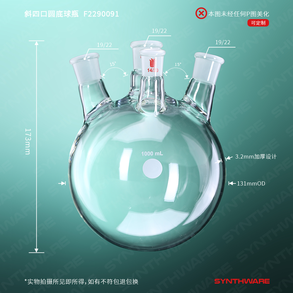 斜四口圆底球瓶,中磨口:19/22,侧口:19/22,前口:19/22,1000ml F2290099