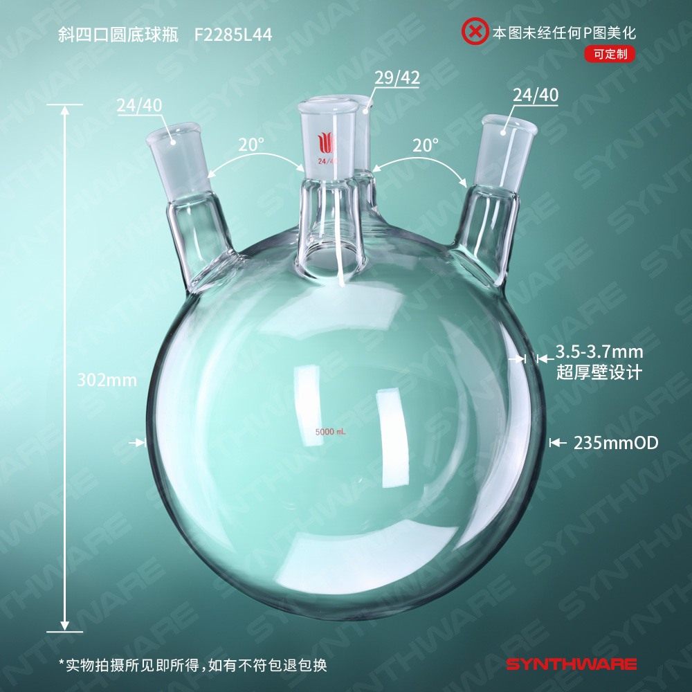 斜四口圆底球瓶,主口:34/45,侧磨口:29/42,前口24/40,,5000ml F22385L