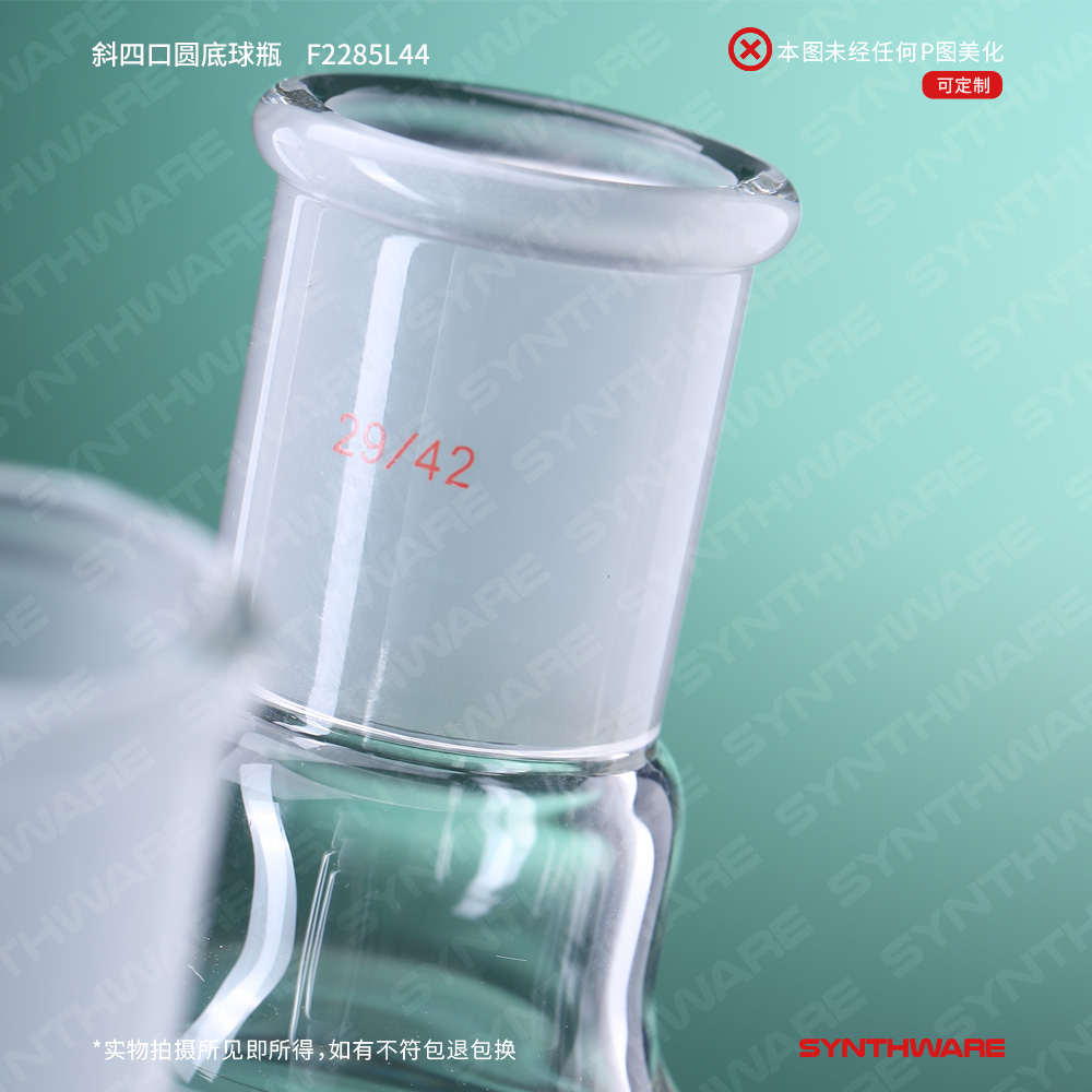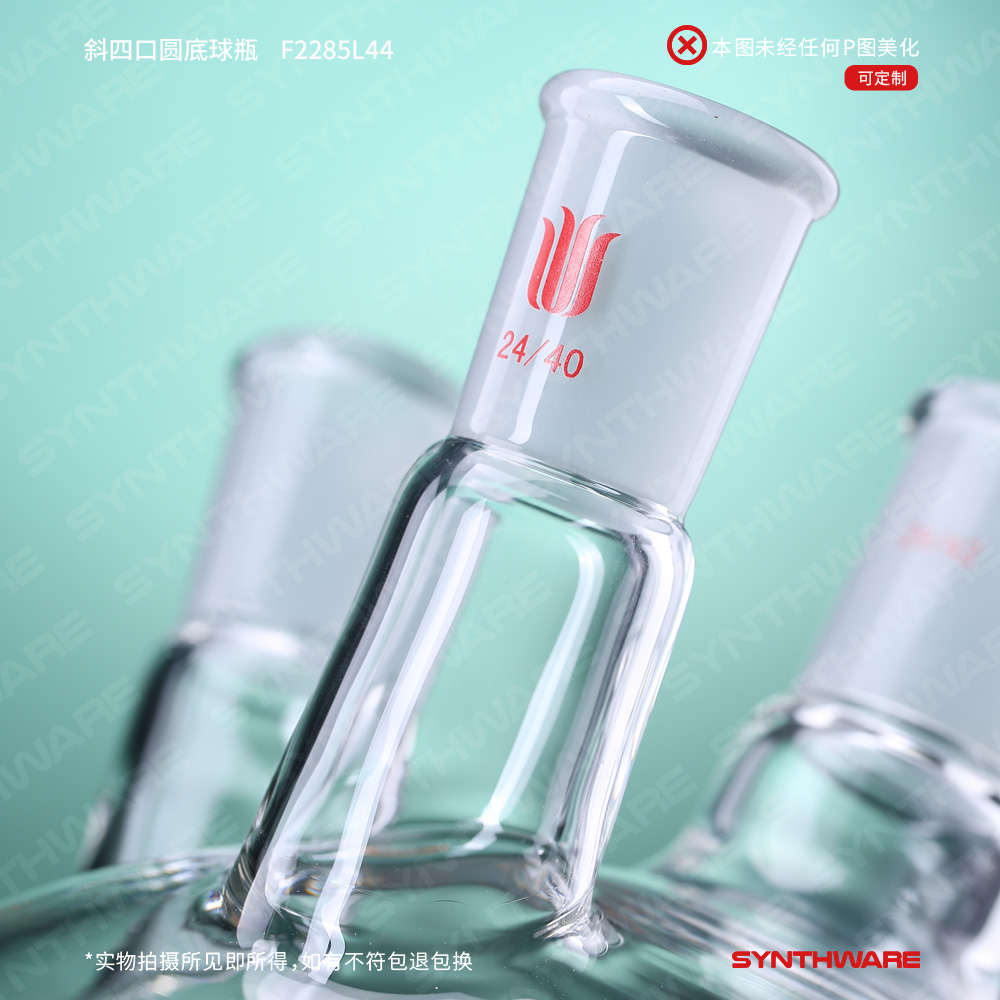 侧口可根据需求连接其他功能性接头或装置如:通气接头,冷凝器,加料漏斗等。不建议连接温度计或温度计套管类产品,如果需要连接温度计类产品请选购F21X小角度四口瓶系列。