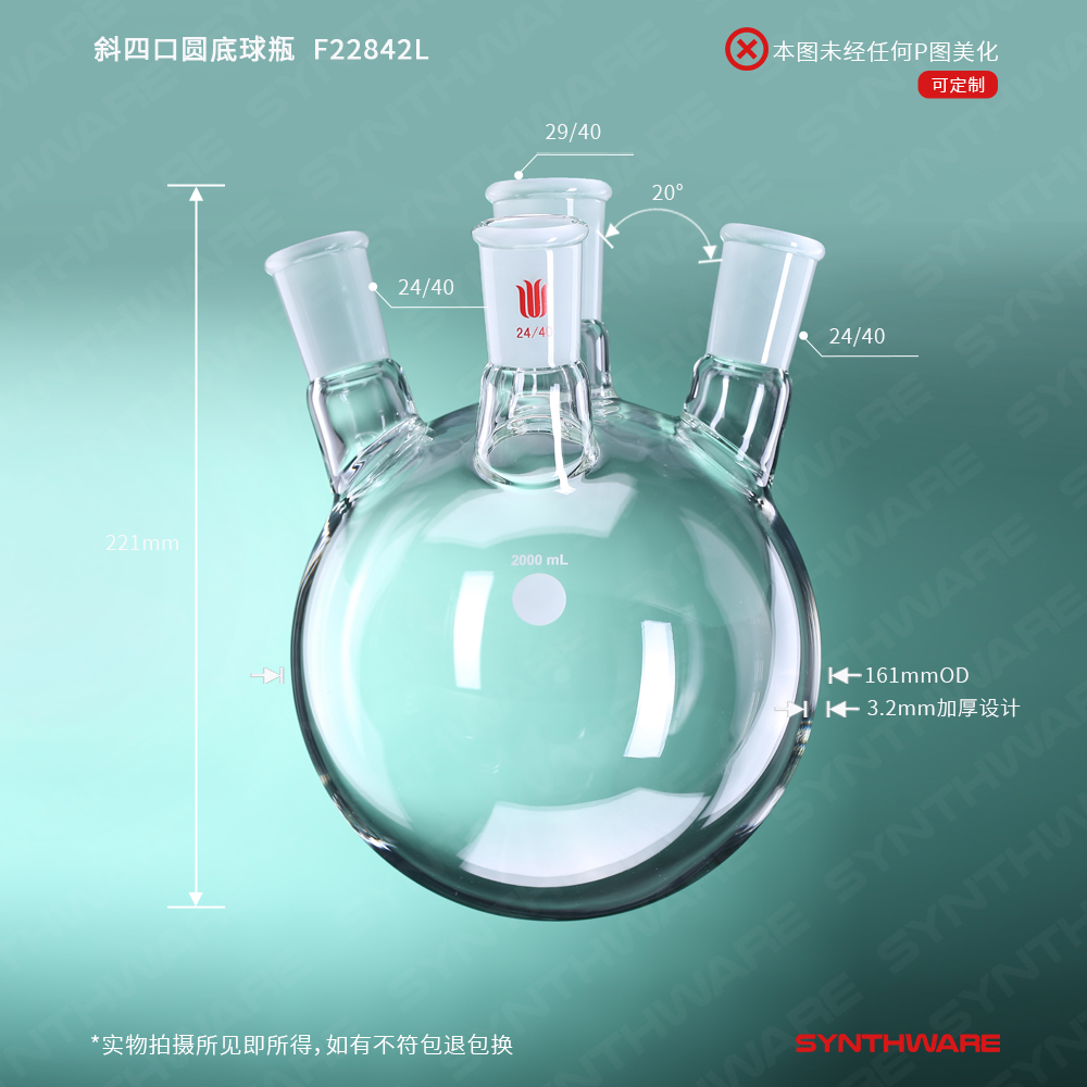 斜四口圆底球瓶,中间磨口:24/40,侧磨口:24/40,2000ml F22242L