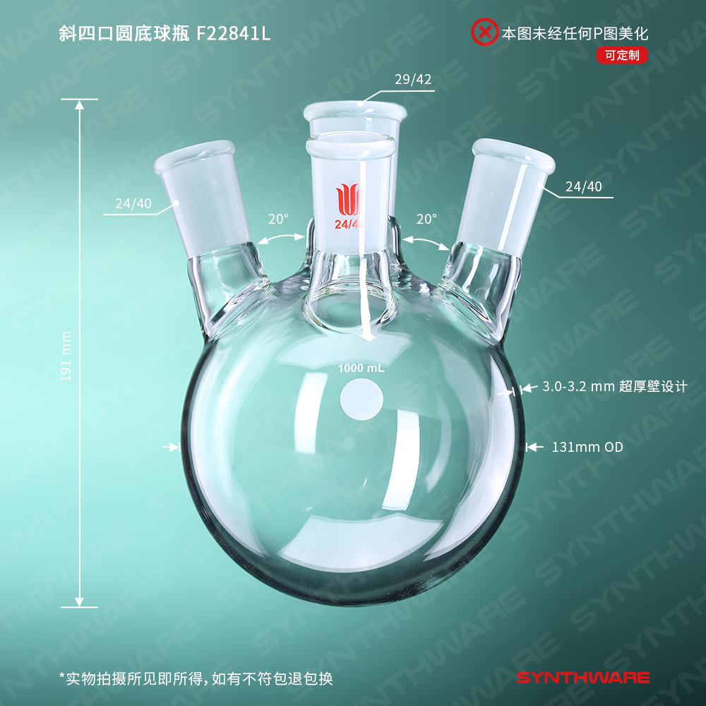 斜四口圆底球瓶,中磨口:29/42,侧口:24/40,前口:19/22,1000ml F2280049