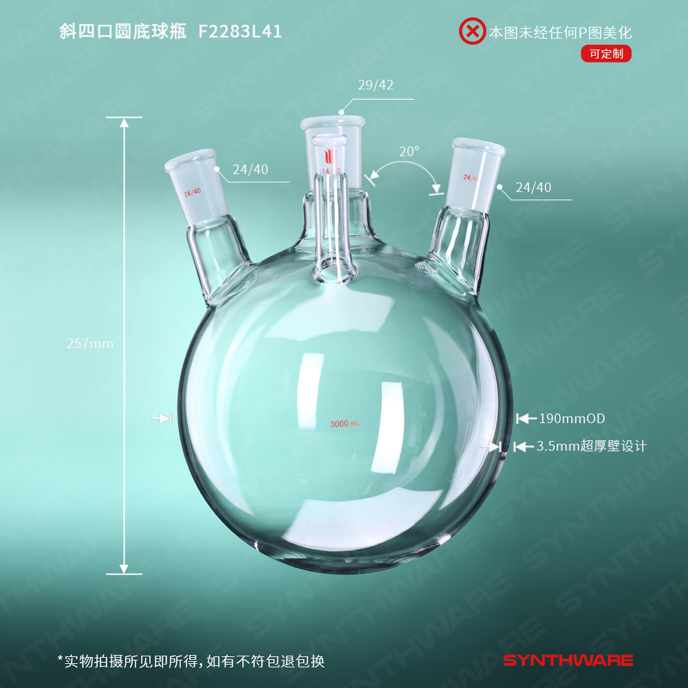 斜四口圆底球瓶,主口:29/42,侧磨口:29/42,前口24/40,3000ml F22293L