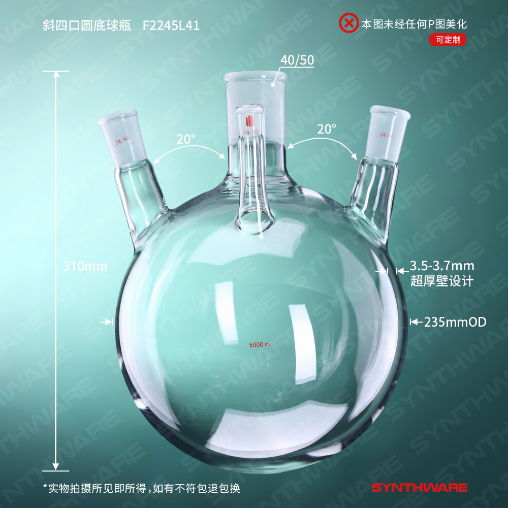 斜四口圆底球瓶,主口:34/45,侧磨口:29/42,前口24/40,,5000ml F22385L