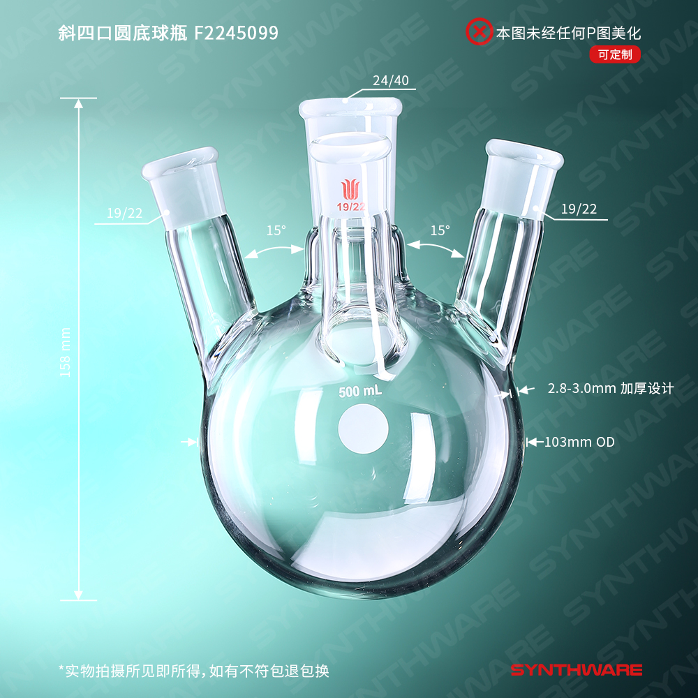 斜四口圆底球瓶,中间磨口:34/45,侧磨口:24/40,500ml F223500