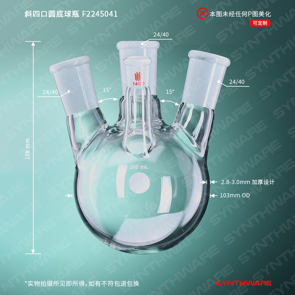 斜四口圆底球瓶,中口:29/42,侧口:24/40,前口:14/20,500ml F2225041
