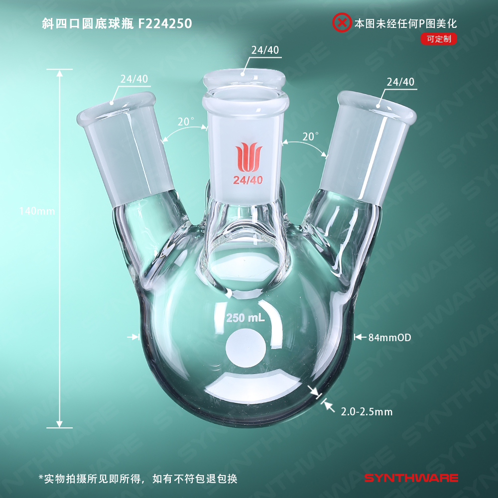 侧口可根据需求连接其他功能性接头或装置如:通气接头,冷凝器,加料漏斗等。不建议连接温度计或温度计套管类产品,如果需要连接温度计类产品请选购F21X小角度四口瓶系列。