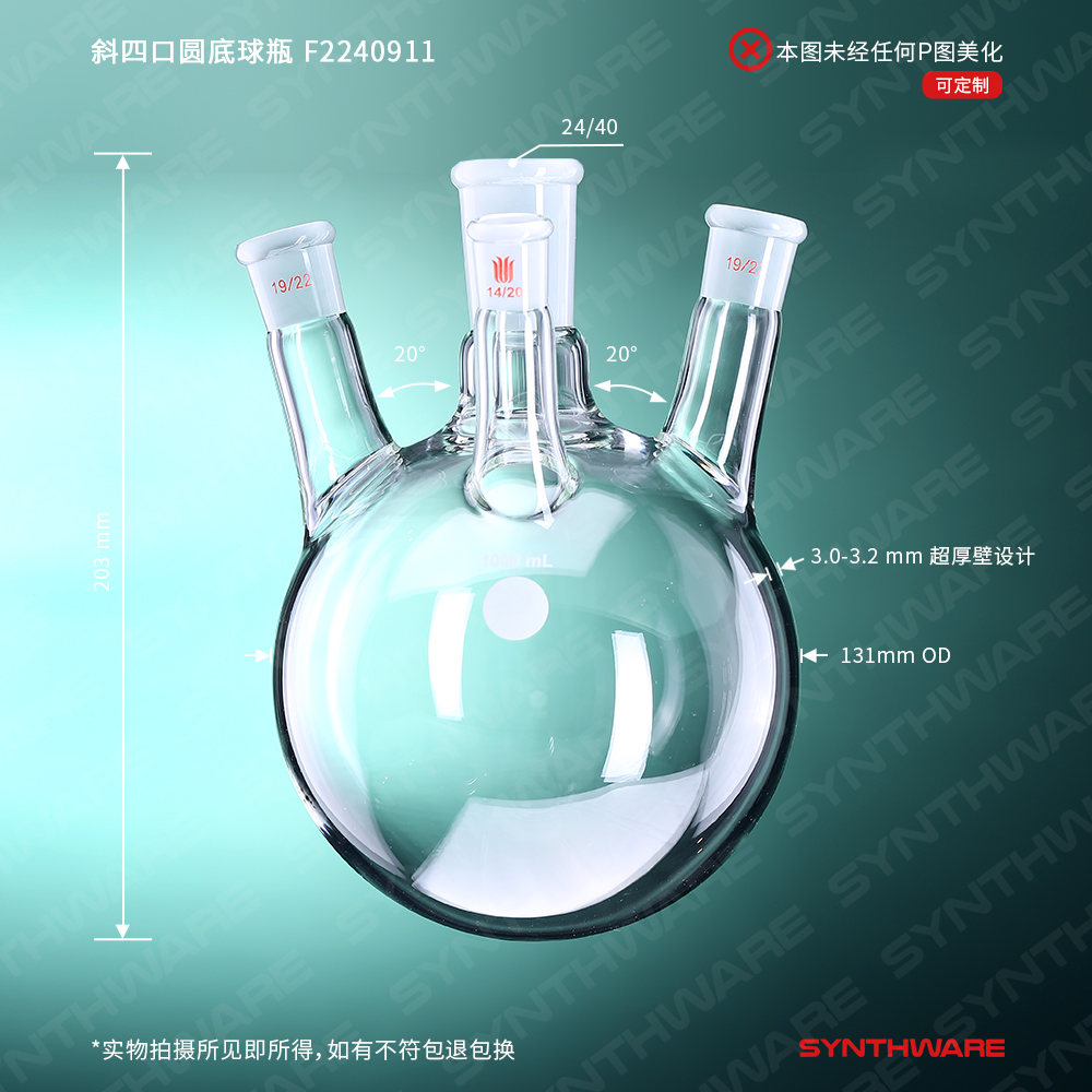 斜四口圆底球瓶,主口:29/42,侧磨口:29/42,前口24/40,3000ml F22293L
