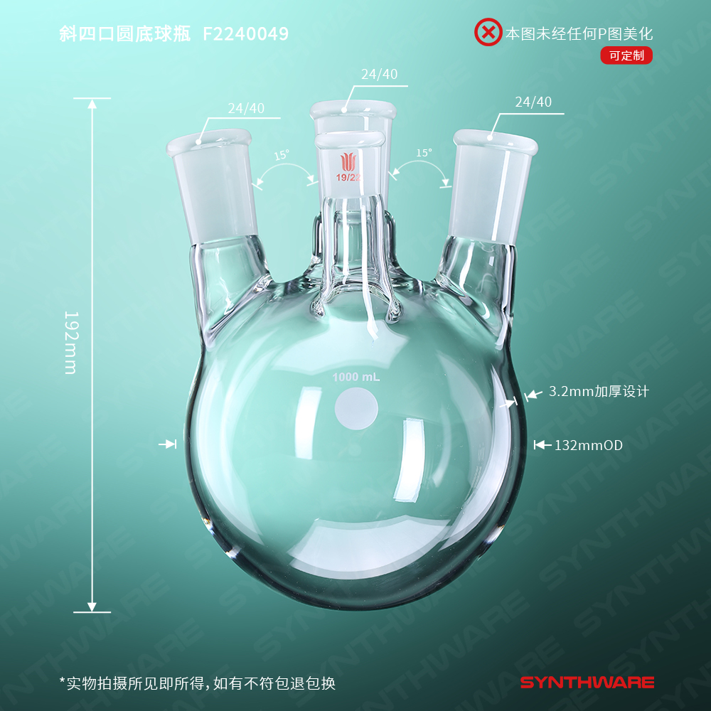 斜四口圆底球瓶,中磨口:19/22,侧口:19/22,前口:14/20,1000ml F2290091