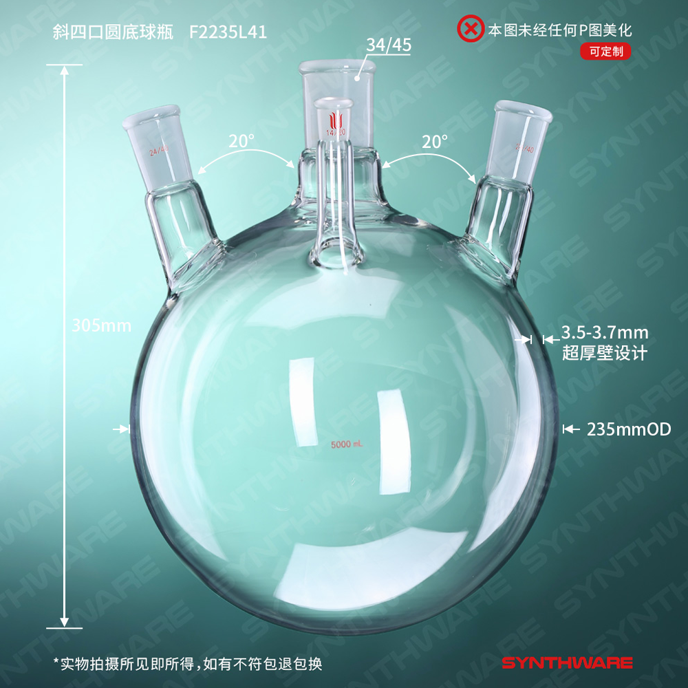 斜四口圆底球瓶,中间磨口:34/45,侧口和前口:24/40,5000ml F22345L